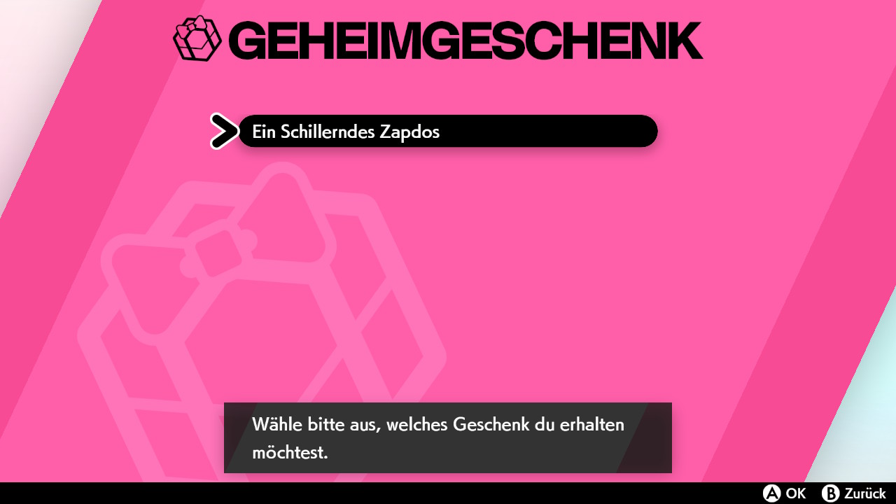 Nutzt nun die Funktion „Geheimgeschenk erhalten“ und ihr findet hier den neuen Menüpunkt „Belohnungen aus dem Kampf-Stadion erhalten“. Hier steht jetzt euer Schillerndes Galar-Zapdos zur Abholung bereit! Glückwunsch!