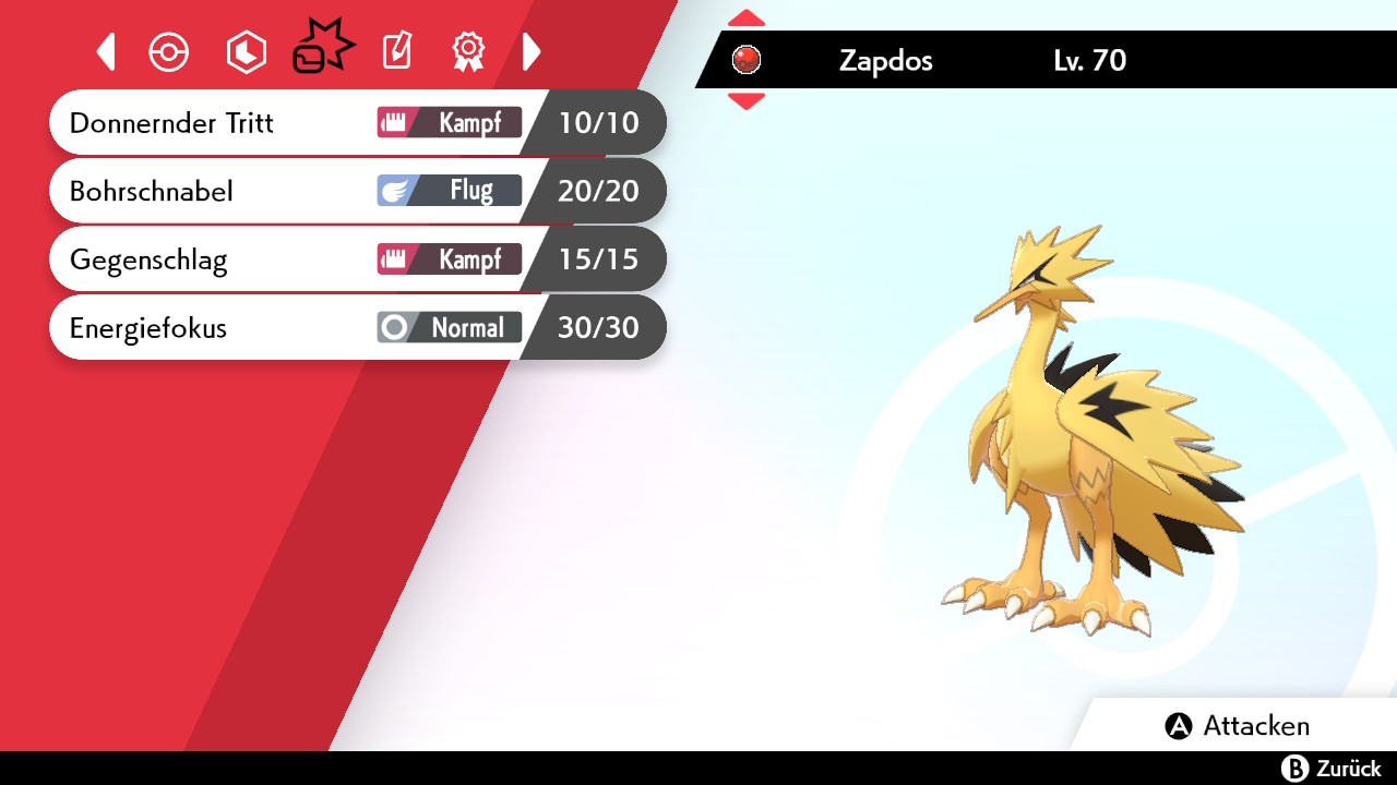 Das Schillernde Galar-Zapdos ist vom Level 70 und beherrscht die Attacken Donnernder Tritt, Bohrschnabel, Gegenschlag und Energiefokus. Vergesst nicht, im Anschluss das Spiel zu speichern.