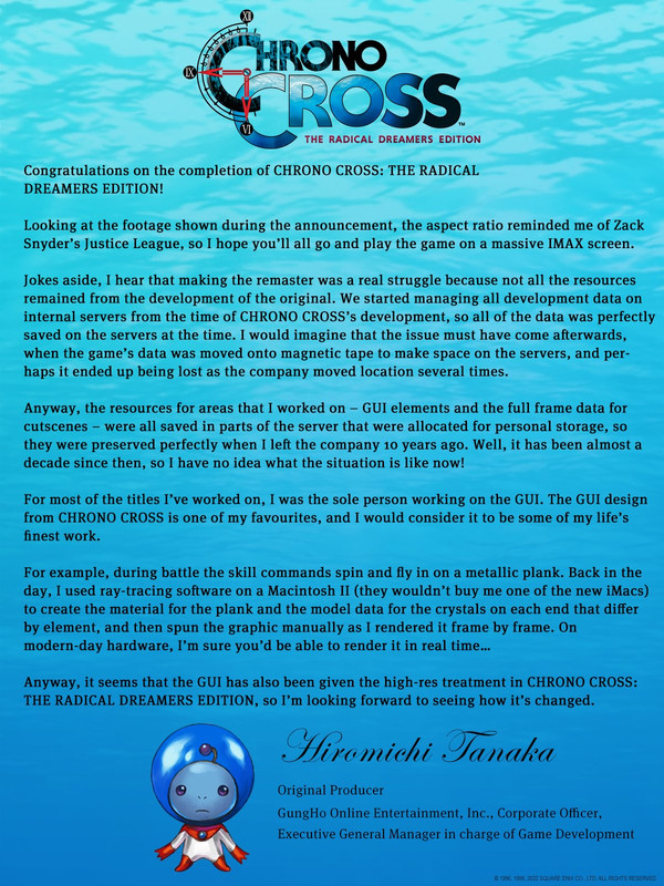 Wir erfahren beispielsweise, dass der Spielecode größtenteils verloren war. „Es ist eine echte Schande, aber leider waren der Spielecode und die Grafikdaten nicht mehr komplett erhalten“, so Sakamoto. Das ist natürlich ein Grund mehr, Chrono Cross zu remastern und für die Nachwelt zu erhalten.