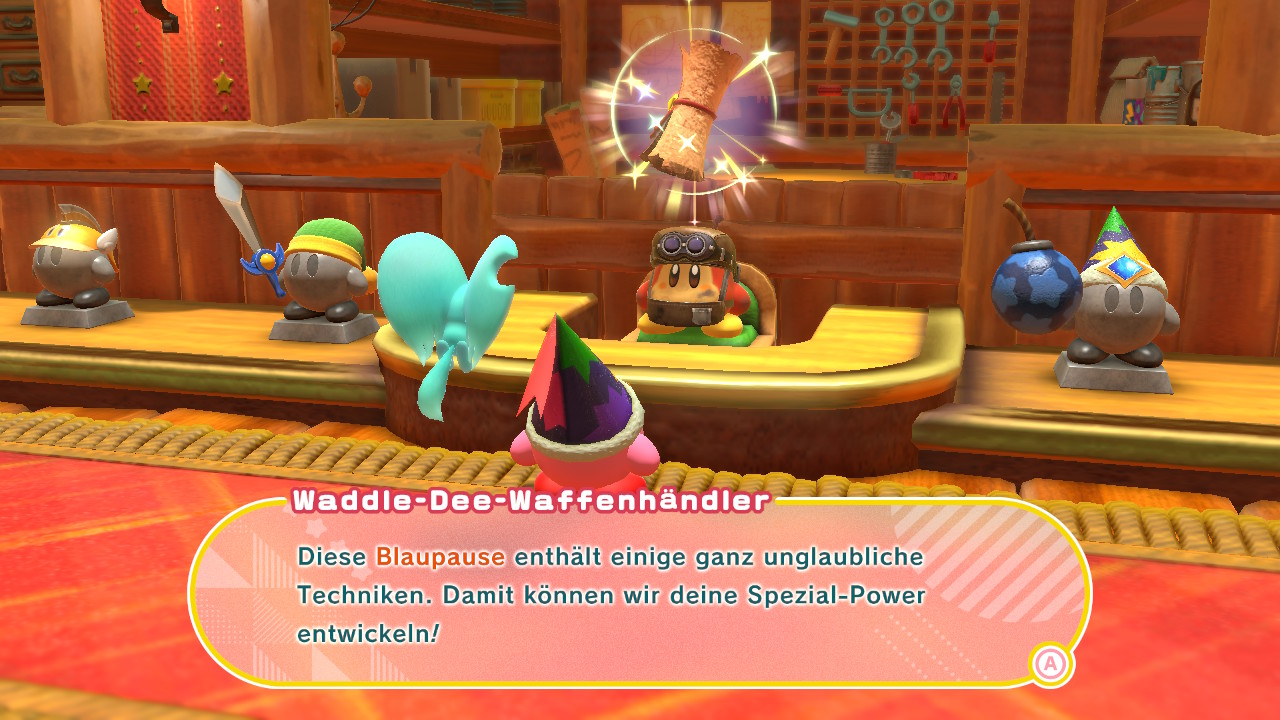Nach den ersten paar Leveln findet Kirby die erste von vielen Blaupausen, die er in der Werkstatt der Waddle-Dee-Stadt abgeben kann. Dies ermöglicht es dem dort ansässigen Waffenhändler mittels Sternmünzen und seltenen Steinen eine Fähigkeit zu verstärken. Aus der Bombe wird so beispielsweise eine Bombenkette, mit der Kirby durch eine Linie verbundene Bomben werfen kann, die je nach Anzahl der Bomben eine größere Menge an Schaden austeilen. Diese Aufwertungen machen vor allem die sonst weniger spannenden Fähigkeiten interessanter.