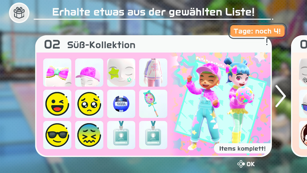 Wer anfangs einen Sportsmate erstellt, wird schnell sehen, dass die Optionen zur Individualisierung des Avatars gar nicht so umfangreich ausfällt, wie es sonst von einem Charakter-Editor zu erwarten wäre. Hier kommt das erwähnte Herzstück von Switch Sports ins Spiel – der globale Online-Modus. Jede Woche wird ein neues Set mit zwölf Individualisierungsoptionen veröffentlicht. In diesen Sets befinden sich etwa Gesichtsmerkmale, Kleidungsstücke, Accessoires, Emoji und weitere Elemente. Um diese Gegenstände zu erhalten, müssen via Online-Matches Punkte gesammelt werden. Sind 100 Punkte gesammelt, kann ein Set ausgewählt werden und es wird per Zufallsprinzip ein Gegenstand verliehen.