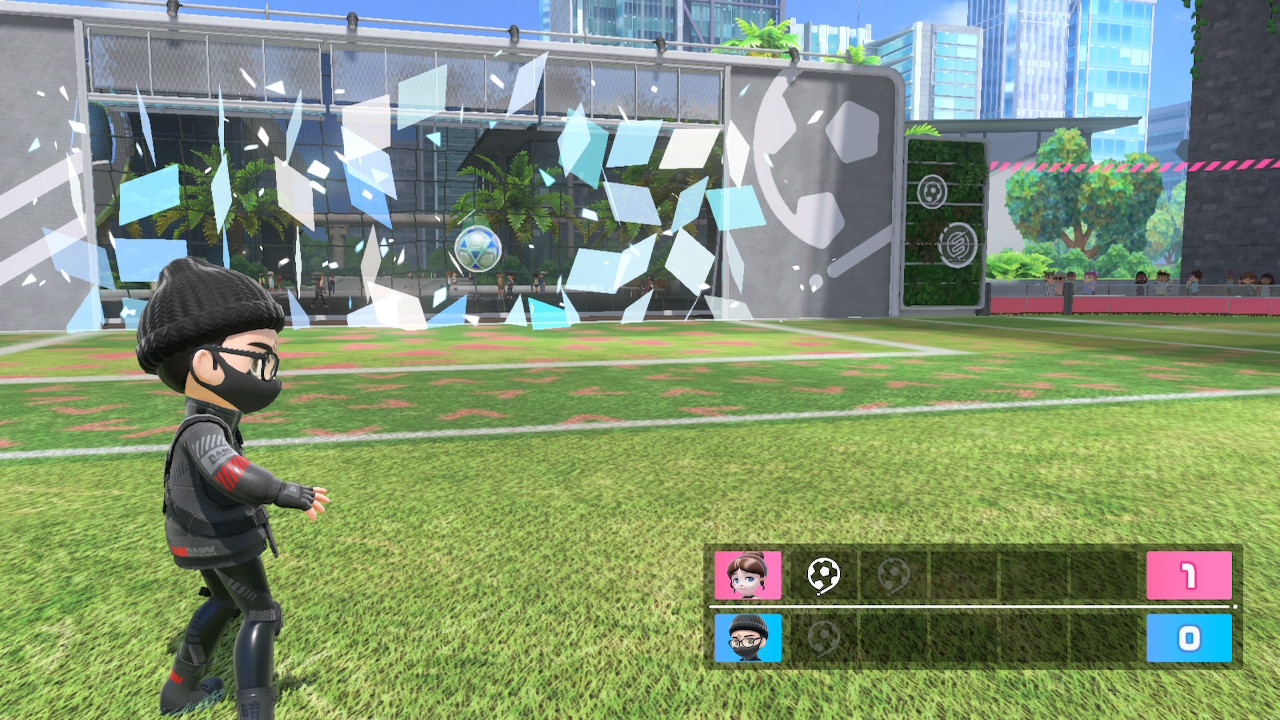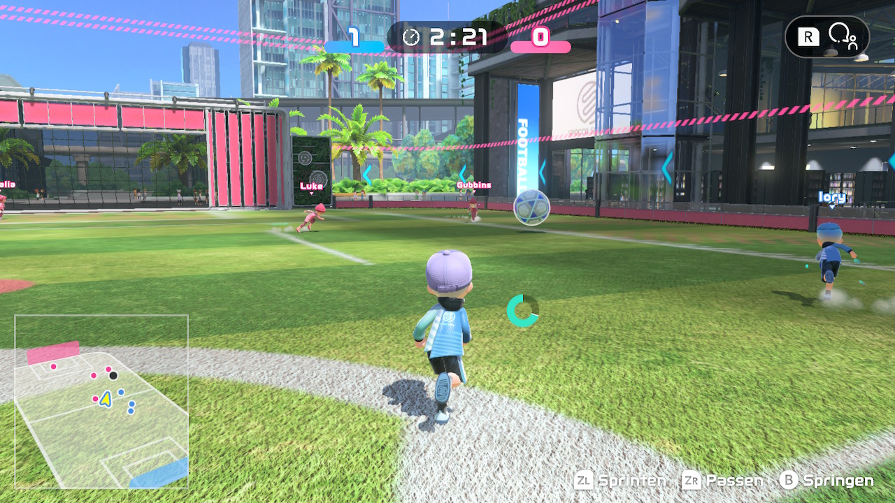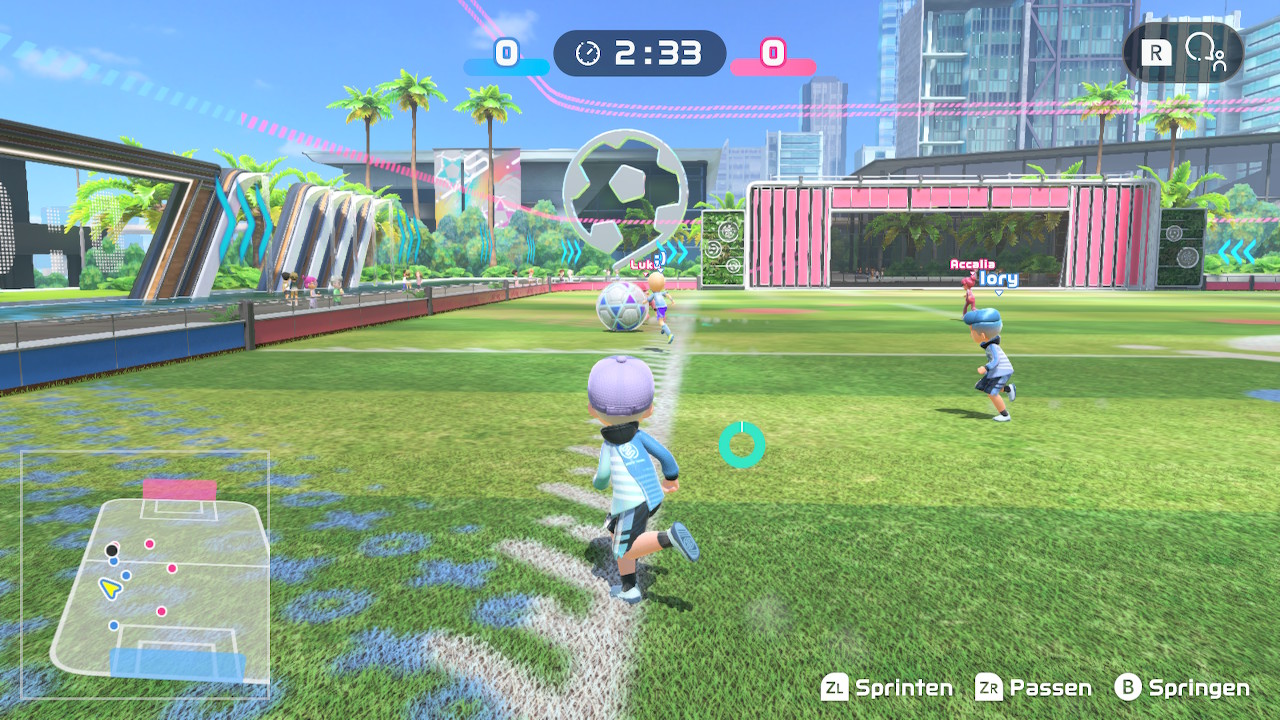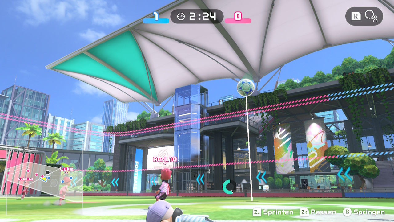 Wer Rocket League zuvor gespielt hat, der wird hier auf ziemlich ähnliches Gameplay treffen. Fußball in Switch Sports setzt zwei Teams mit vier Spielern vor die Aufgabe, einen riesigen Ball in das gegnerische Tor zu pfeffern. Für die Steuerung werden zwei Joy-Con benötigt, denn der linke Stick steuert die Figur, der rechte die Kamera. Diverse Knöpfe sind mit Sprung, Sprint, Pass und Rufen belegt. Gekickt wird der Ball mit dem Schwung des rechten oder linken Joy-Con – werden beide geschwungen, so setzt die Figur zu einem amüsant aussehenden Flugkopfball an. Doch Achtung, Sprints und Flugkopfbälle verwenden Ausdauer, die in einer kreisförmigen Leiste am Charakter angezeigt wird. Ist diese leer, muss sich diese erst wieder etwas füllen, damit gerannt oder geköpft werden kann.