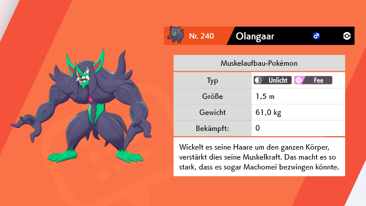 Auch das Olangaar kommt mit dem Level 50 und hat ein Kampfmeisterband. Es hat ein sachtes Wesen und beherrscht die Fähigkeit Strolch. Folgende Attacken bringt es mit: Seelenbruch, Grimasse, Trickbetrug und Verhöhner. Außerdem trägt das Item Fluchtknopf.