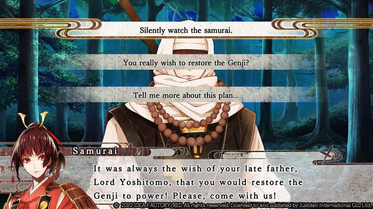 Die Historiker:innen unter euch sollten wohl das Spiel mit einem geschlossenen Auge betrachten, da sich die Handlung eher lose am Genpei-Krieg orientiert. Wenn ihr jedoch mit der Geschichte vertraut seid, werdet ihr den einen oder anderen AHA!-Moment erleben. Andererseits müsst ihr euch auch als Banausen in dem Gebiet nicht fürchten. Mir war dieser spezifische Krieg vor dem Spielen ebenfalls nicht bekannt und spätestens ab der zweiten Route konnte ich den Ereignissen problemlos folgen.