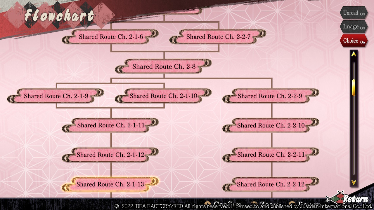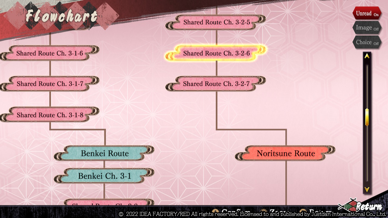 Technisch ist das Spiel, wie bei aktuellen Otomes üblich, gelungen und bequem umgesetzt. Am Switch-Handheld lassen sich diverse Funktionen wie das Aufrufen des Menüs und das Weiterführen der Dialoge am Touchscreen ausführen, was einen kleinen Pluspunkt darstellt. Ihr könnt euer Spielerlebnis individuell anpassen sowie ein Baum-Diagramm aufrufen, welches euch die verschiedenen Routen anzeigt. In dieser Hinsicht braucht sich Birushana definitiv nicht zu verstecken.