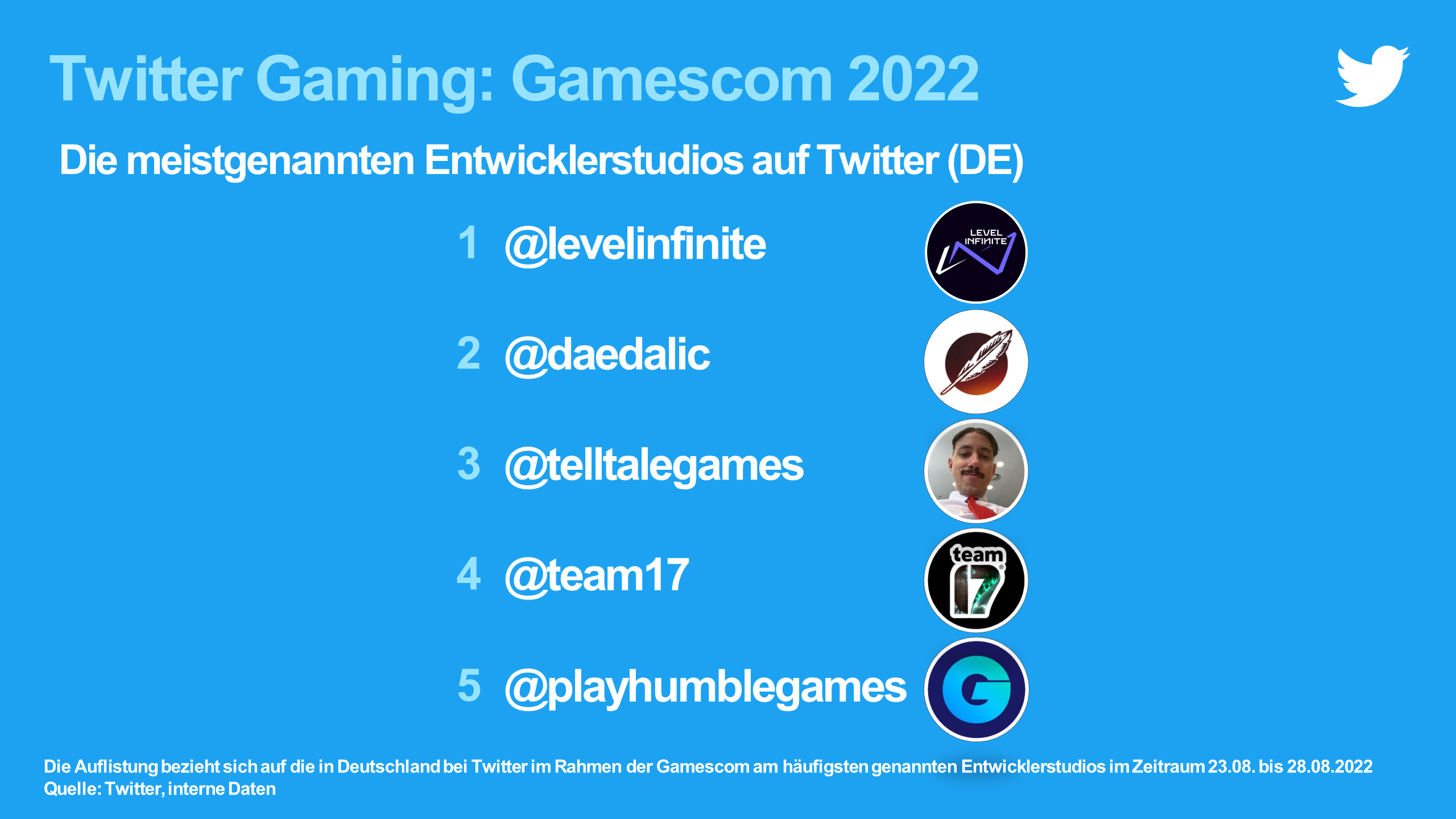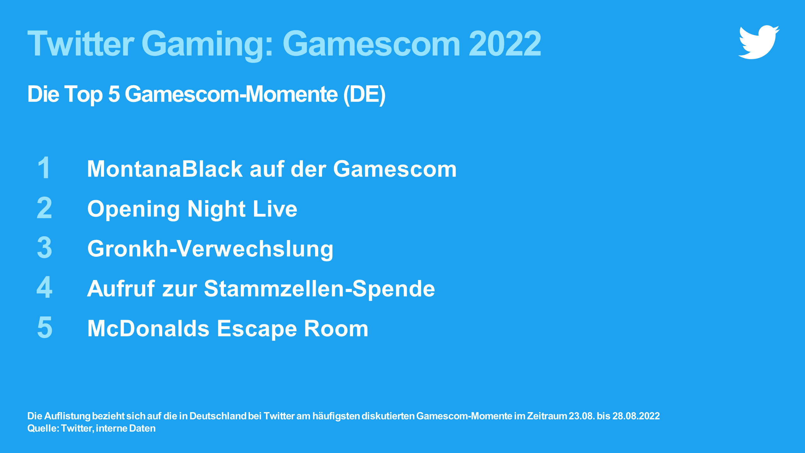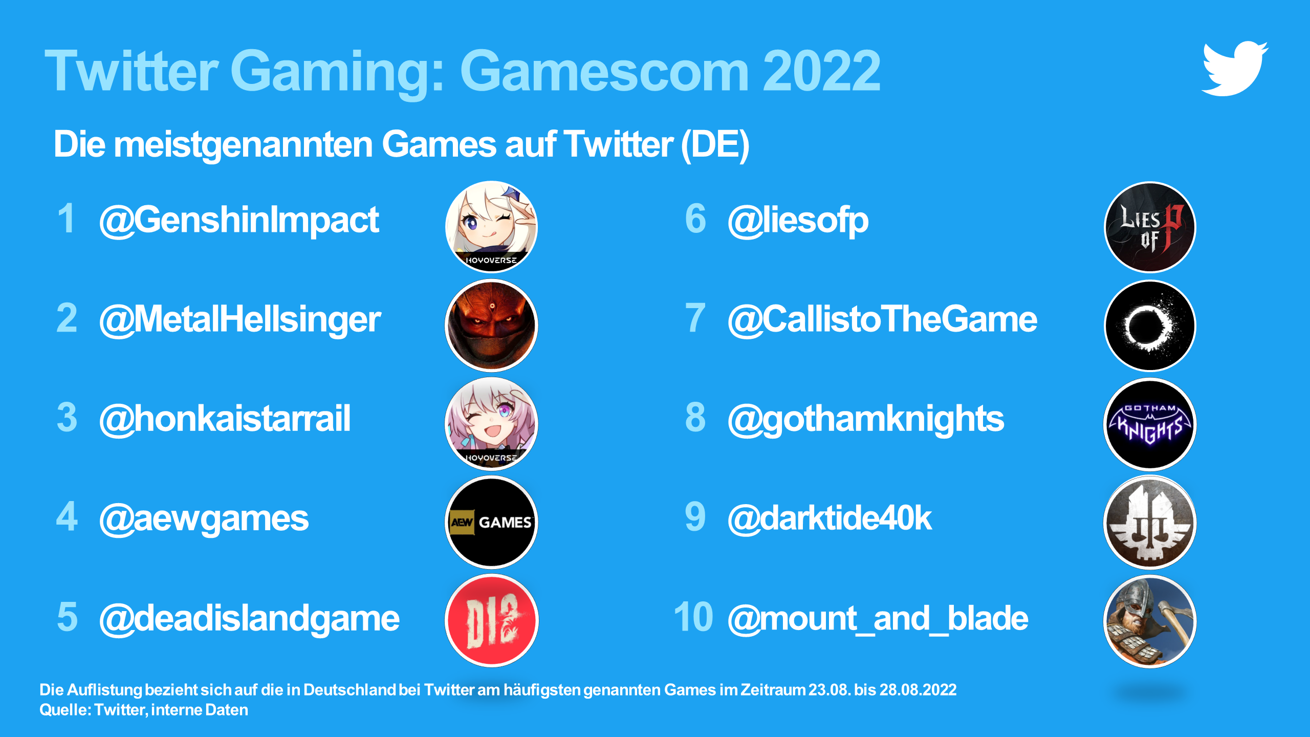 Damit auch Spiele eine Rolle spielen, gibt es noch weitere Kategorien. Das meistgenannte Spiel bei Twitter war Genshin Impact, gefolgt von Metal: Hellsinger. Lies of P, das drei Gamescom-Awards abräumte, landet auf Rang 6. Diese und weitere Statistiken: