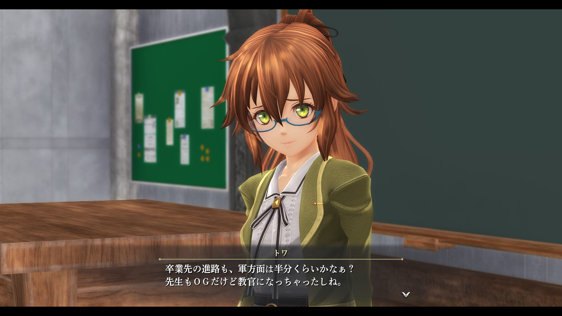 Mich freut das mit Towa ein weiterer Cold Steel-Charakter bzw Charakter aus dem vorherigen Arc vorkommt, was dem Spiel mehr Verbundenheit gibt zu den Vorgänger und zeigt, wie manch Charaktere mit zunehmenden Alter sich weiterentwickeln, in ihrem Fall von kleiner Schülerrats-Maus zur Kommandantin eines Flugschiffs in Kriegszeiten, hin zur Lehrerin an eine Zweigstelle der Militärakademie ihrer Wurzeln, und nun scheinbar hin zu einer gewöhnlichen Lehrerin einer Hochschule. Was ein Werdegang