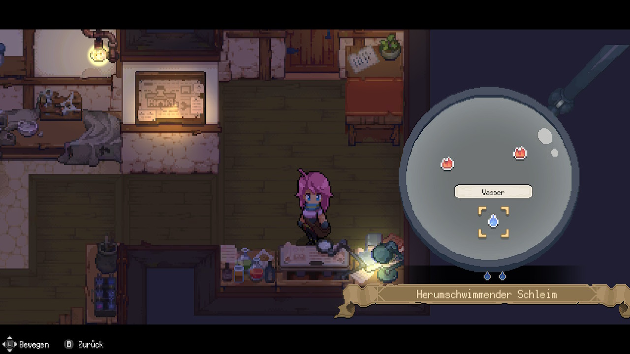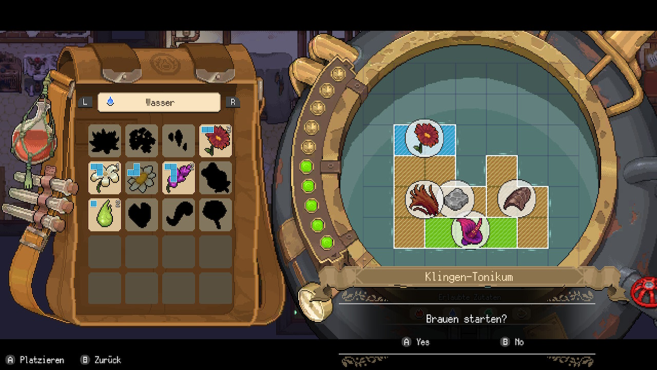 Nach der Diagnose geht es dann ans Tränke brauen. Jeder Trank formt sich aus einem aus Quadraten bestehenden Feld, in das die Zutaten eingesetzt werden müssen. Ähnlich wie in Tetris sind den einzelnen Zutaten bestimmte Bausteine zugeordnet, die allesamt passend ins Feld eingebaut werden müssen. Im weiteren Spielverlauf kommen immer komplexere Tränke hinzu, die gebraut werden müssen und dementsprechend noch größeres logisches Denken abverlangen.