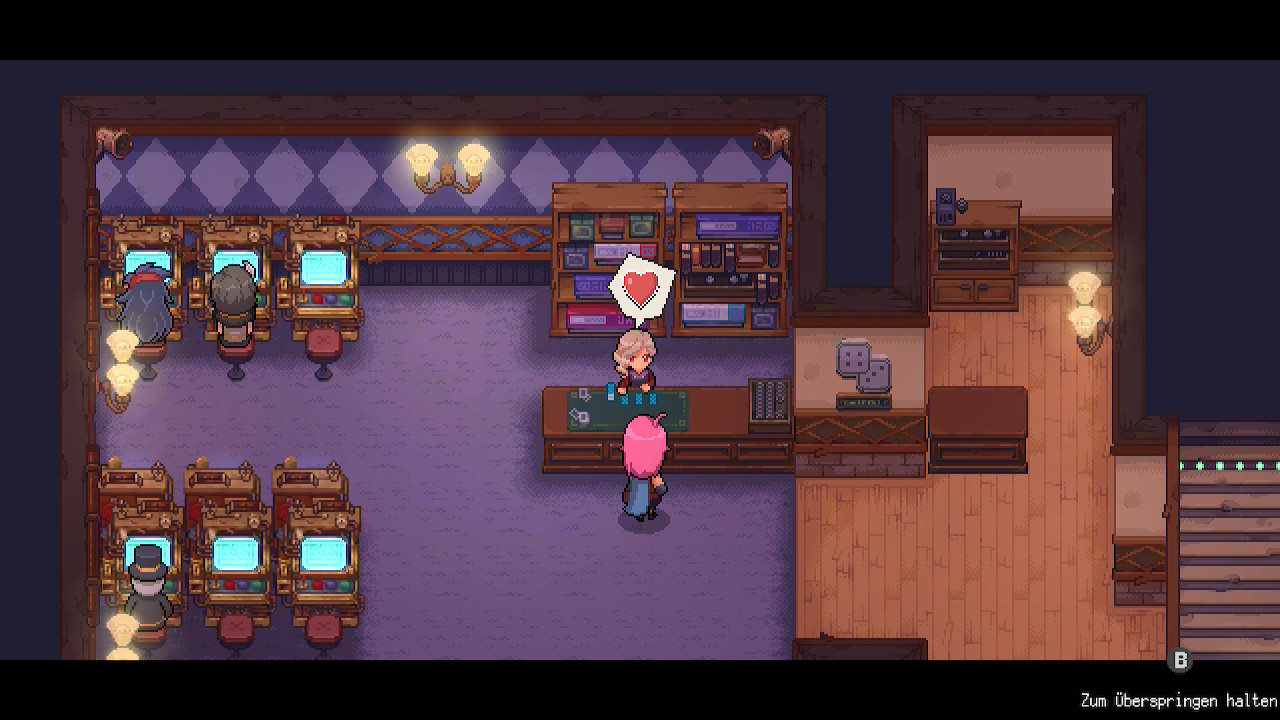 Auch die Spielautomaten in der Arcade-Halle sind verbuggt und funktionieren nicht richtig. Das ist vor allem deshalb schade, weil es sonst nicht viele andere Nebenbeschäftigungen in Potion Permit gibt. Wir können lediglich angeln, um Zutaten für Gerichte zu erhalten.