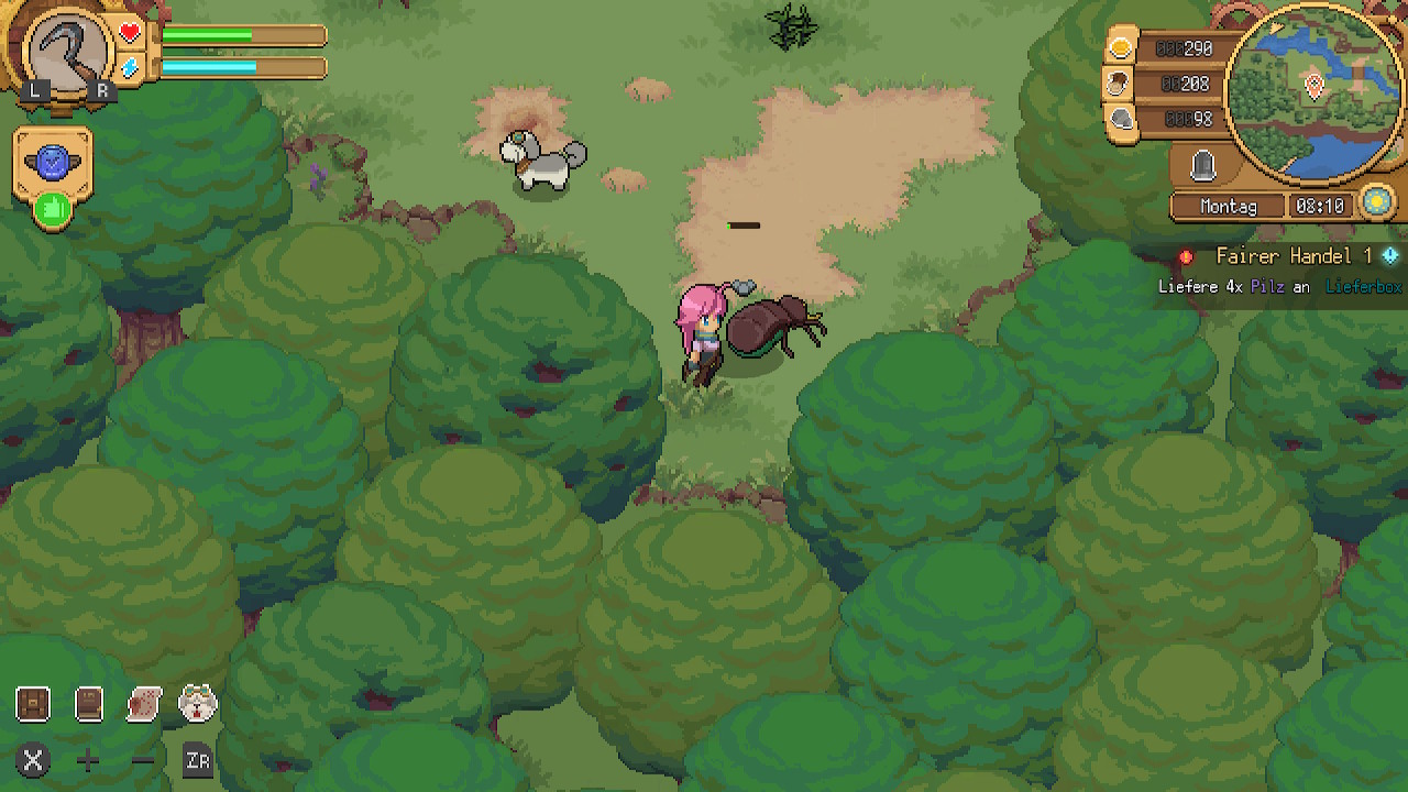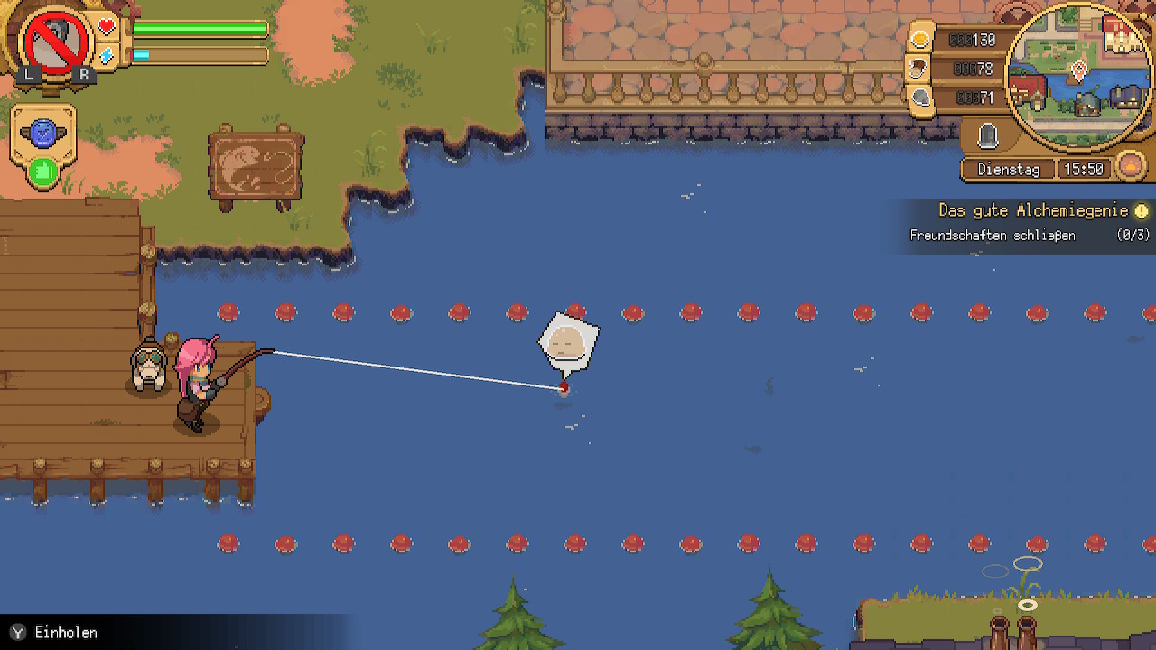 Hinzu kommt, dass die Zeit verhältnismäßig schnell in Potion Permit fortschreitet. Wollen wir uns auf die Suche nach Zutaten machen, angeln und gleichzeitig alle Bewohner einmal ansprechen, ist ein Tag proppenvoll gepackt. Es ist hier also ein gutes Zeitmanagement gefragt, damit die Tage nicht einfach so verschwendet werden, ein Bewohner womöglich als Nächstes ins Krankenhaus geliefert wird und so einen Tag ausfällt.