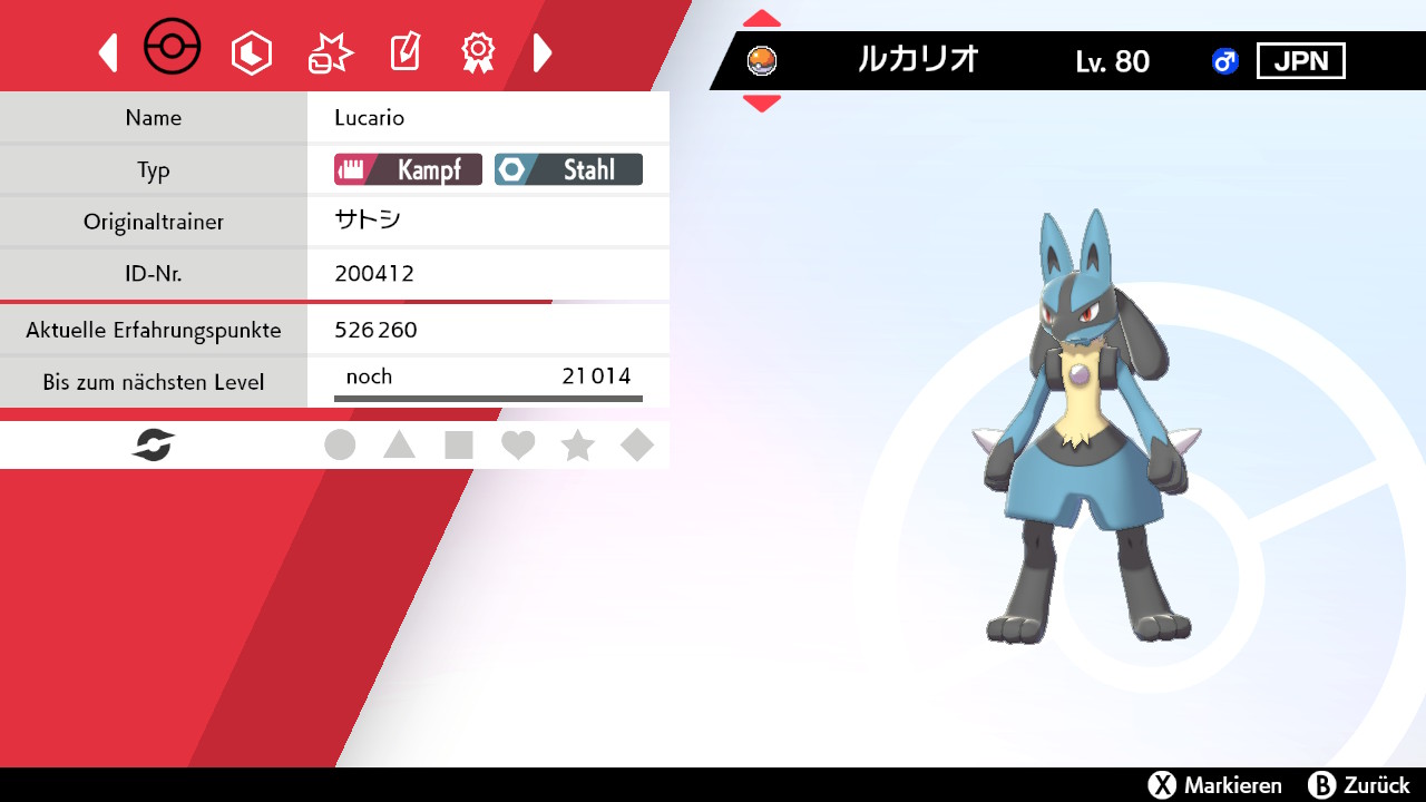 Heute geht es mit einem besonderen Lucario weiter, der gleichzeitig den Abschluss dieser Verteilaktion bildet. Das Lucario ist von Level 80 und trägt ein Klassisches Band. Es beherrscht die Attacken Aurasphäre, Patronenhieb, Gegenschlag und Stahlstrahl sowie die Fähigkeit Konzentrator.