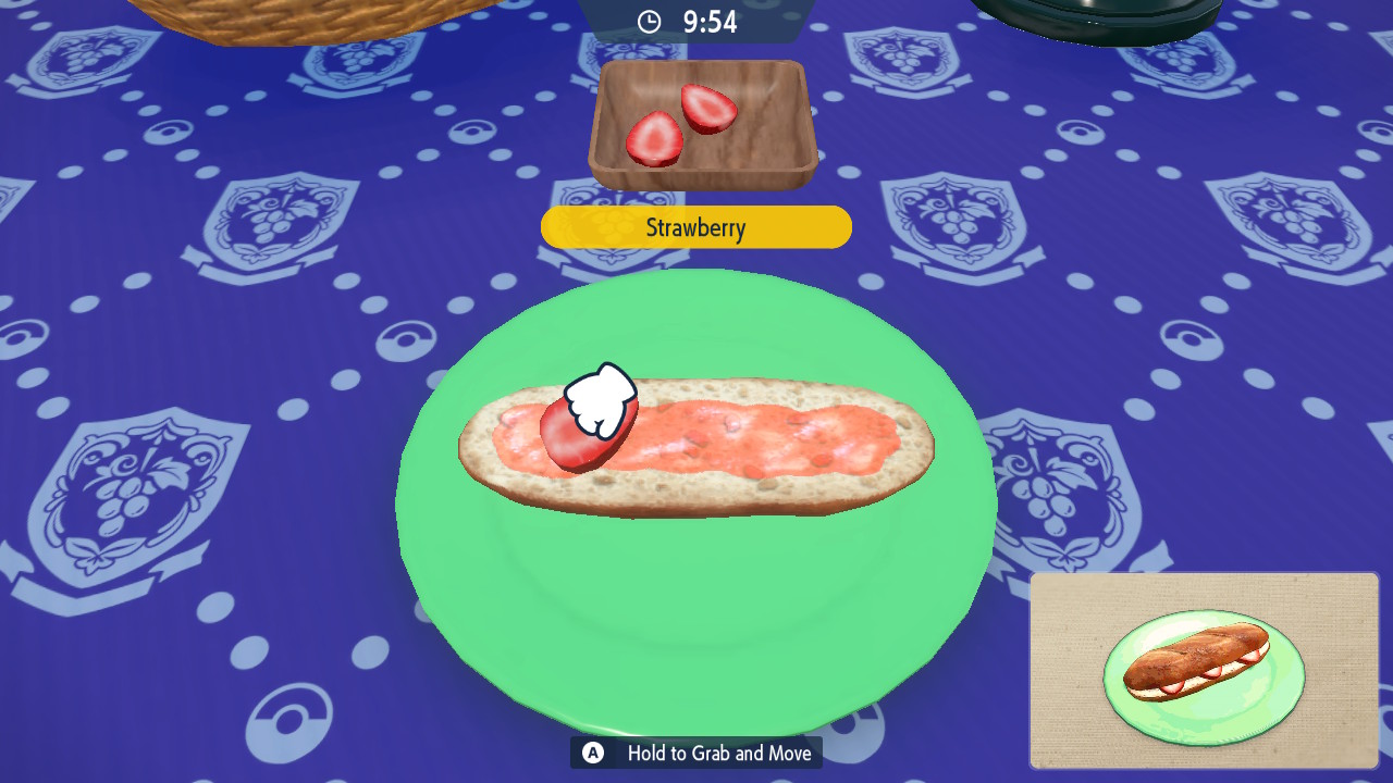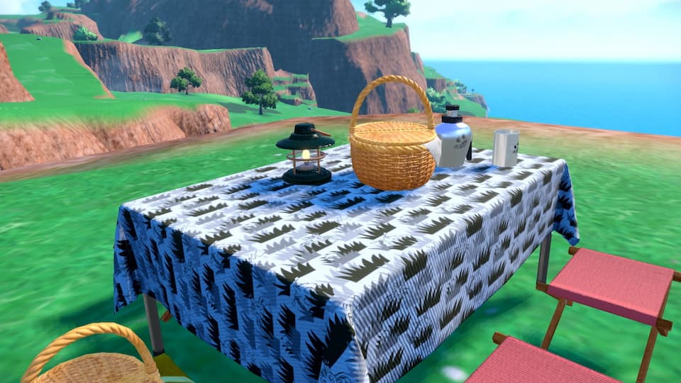 Nachdem ich gut ein Drittel Paldeas erkundet habe, wird es Zeit für eine kleine Pause. Ich baue den Picknick-Tisch auf und lasse meine Pokémon aus ihren Bällen. Während eines Picknicks kann ich meine Pokémon waschen, die vom Kämpfen schmutzig geworden sind, um ihre Zuneigung und ihr Wohlbefinden zu steigern. Der Hauptzweck eines Picknicks ist aber die Zubereitung von Sandwiches, Paldeas Äquivalent zum Curry aus Galar.
