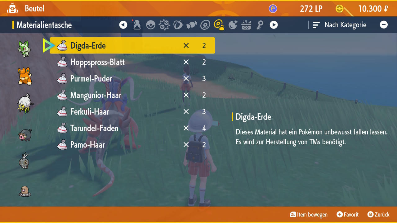 Fleißig sein wird in Pokémon Karmesin und Purpur auch direkt belohnt. Jedes gefangene Pokémon trägt zu diversen Meilensteinen im Pokédex bei, für die ich nützliche Items erhalte. Besiegte oder gefangene Pokémon lassen zusätzlich Materialien fallen, die an der TM-Maschine bei jedem der großzügig über die Region verteilten Pokécenter zur Herstellung von TMs genutzt werden können. Das Konzept gefällt mir sehr gut, aber ich hätte es besser gefunden, wenn ich ähnlich wie bei Legenden Arceus auch andere Gegenstände wie Pokébälle oder Tränke herstellen könnte.