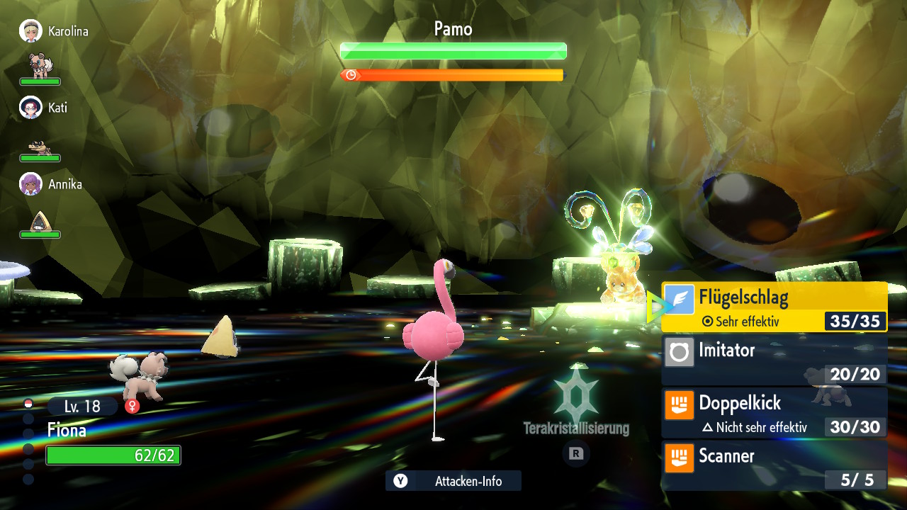 Gelegentlich entdecke ich aber auch hell strahlende Pokémon in der Wildnis, die einen Tera-Typ besitzen, der nicht mit ihrem eigenen Typ übereinstimmt. Das sorgt vor allem in Wettkampf-Situationen für spannende Überraschungsmomente. Beispielsweise kann sich ein Gesteins-Pokémon wie Mogelbaum mit einer Terakristallisierung in ein Pflanzen-Pokémon verwandeln und der Gegner, der noch eben seinen Wasservorteil ausspielen wollte, ist plötzlich im Nachteil.
