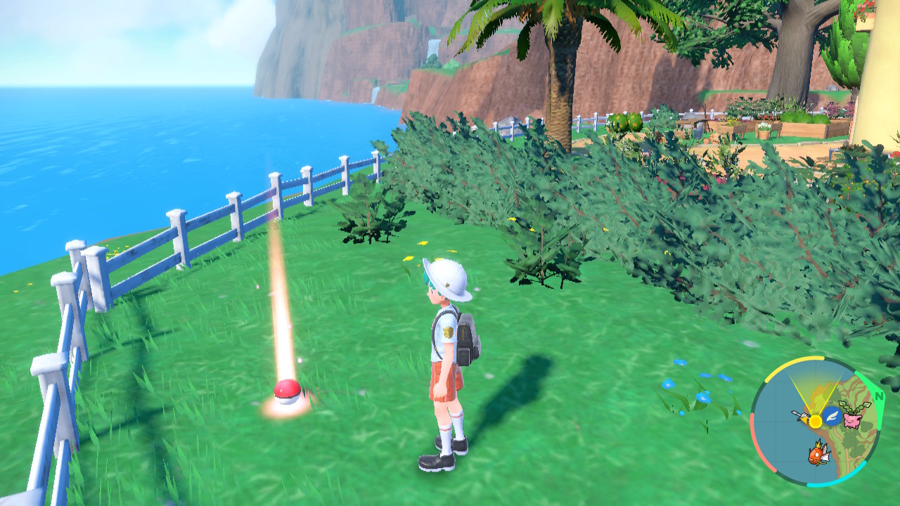 Auf der Minikarte in der unteren Ecke kann ich auf einen Blick sehen, welche Monster sich in meiner Nähe aufhalten. Fliegende und schwimmende Pokémon nehme ich durch gezieltes Werfen ins Visier. Leider kann ich nicht wie in Legenden Arceus fröhlich mit Pokébällen um mich schmeißen und so im Vorbeigehen Pokémon fangen. Ich werfe nämlich das erste Pokémon in meinem Team auf das Ziel, wodurch direkt ein Kampf ausgelöst wird.