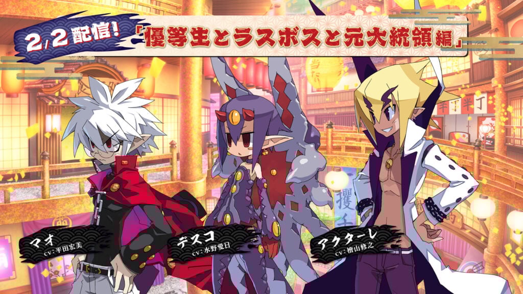 Die DLCs werden in zwei Teilen veröffentlicht. Dem Spieler bleibt die Wahl, einen Season Pass zu kaufen oder die jeweilige DLC einzeln zu erwerben. In den DLCs tauchen bekannte Hauptcharaktere aus den bisherigen Teilen der Serie auf, die mit der neuen Gruppe ein neues Abenteuer erleben. Zu diesen Spielfiguren gehören Laharl, Etna, Rozalin, Adell, Seraphina, Fuka, Mao, Desco, Axel, Valvatorez, Fenrich, Flonne, Killia, Melodia, Raspberyl, Usalia und Artina.