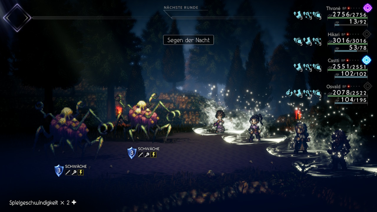 Octopath Traveler II ist und bleibt ein klassisches JRPG und somit gibt es auch zahlreiche Kämpfe zu bestreiten. Diese Begegnungen kommen als Zufallskämpfe daher, ein Umstand, der die Milde des allgegenwärtigen RNG-Gottes voraussetzt. Doch prinzipiell braucht man keine große Angst vor Zufallsbegegnungen zu haben, denn die normalen Kämpfe hangeln sich immer an dem bekannten Prinzip entlang.