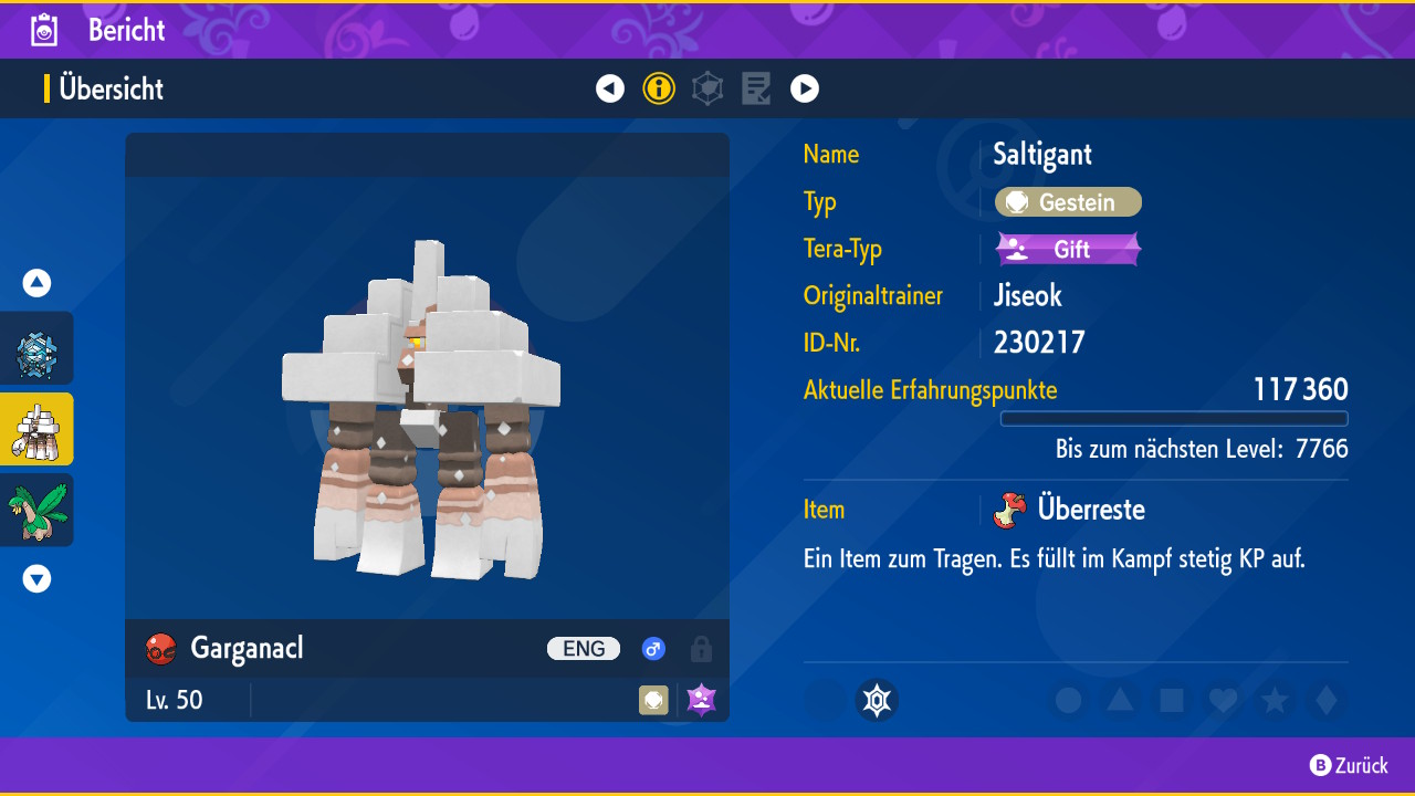 Das verteilte Saltigant hat ein sachtes Wesen und beherrscht die Fähigkeit Läutersalz. Als Attacken stehen Pökelsalz, Genesung, Rundumschutz und Schutzschild zur Verfügung. Saltigant wird außerdem das Item Überreste tragen.