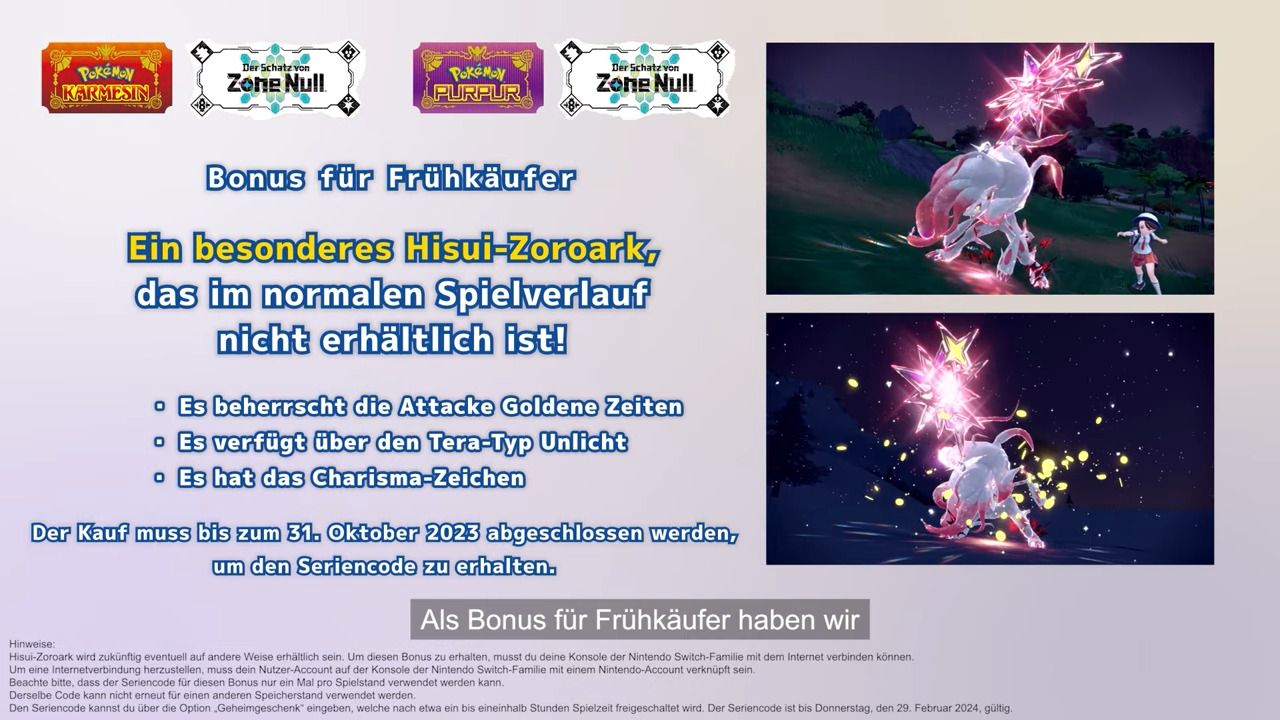 Wer den DLC vorbestellt, hat jetzt schon etwas davon. Bei einer Vorbestellung bis zum 31. Oktober 2023 könnt ihr euch ein Hisui-Zoroark in Pokémon Karmesin und Purpur sichern. Es ist vom Tera-Typ Unlicht und verfügt über eine Attacke, die es normalerweise nicht erlernen kann.
