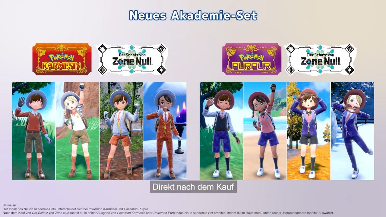 Darüber hinaus erwartet euch nach dem Kauf ein neues Akademie-Set mit Uniformen für Frühling, Sommer, Herbst und Winter, in die ihr in Pokémon Karmesin und Purpur sofort schlüpfen könnt. Na, überzeugt euch das?