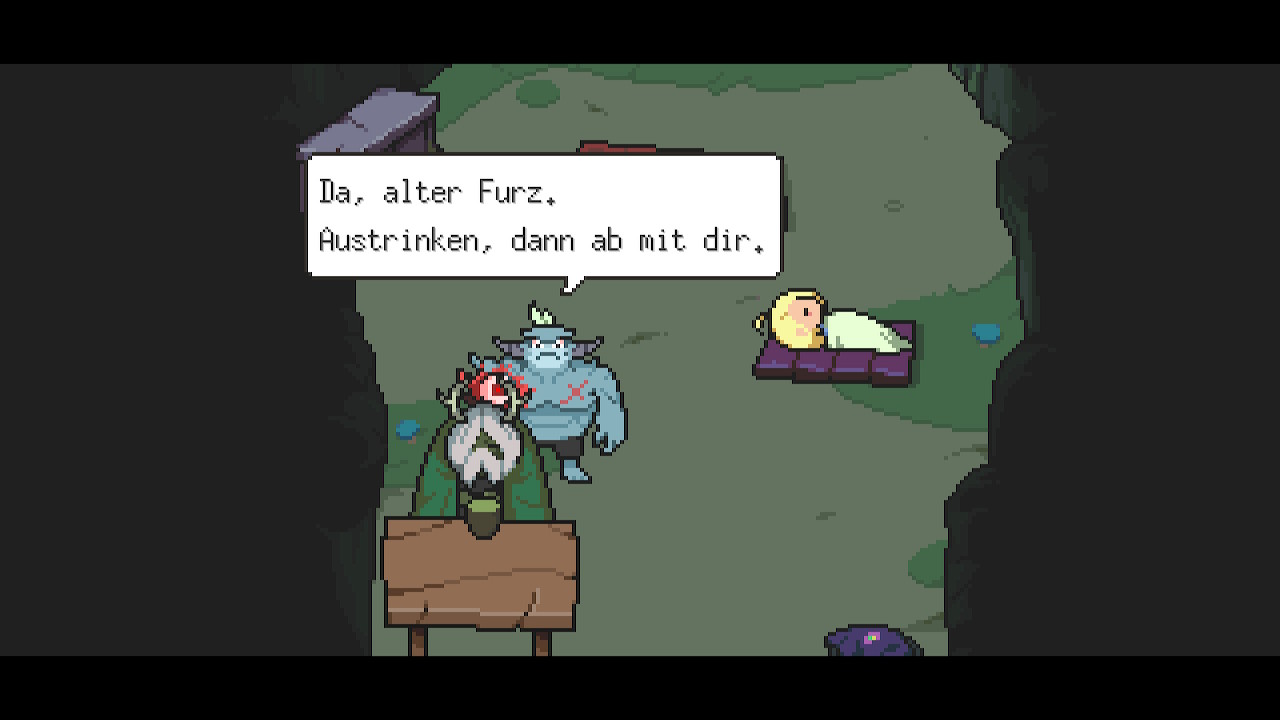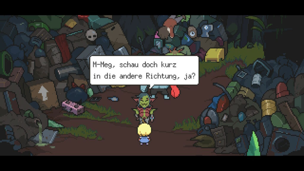Ich habe während des gesamten Spiels gespürt, wie viel Herzblut in Meg’s Monster steckt. Die Charaktere sind sehr abwechslungsreich, von ulkig bis bitterernst ist alles dabei. Jeder Charakter hat beispielsweise einen eigenen Sound, mit dem er spricht. Eine Vertonung gibt es so gesehen nicht.