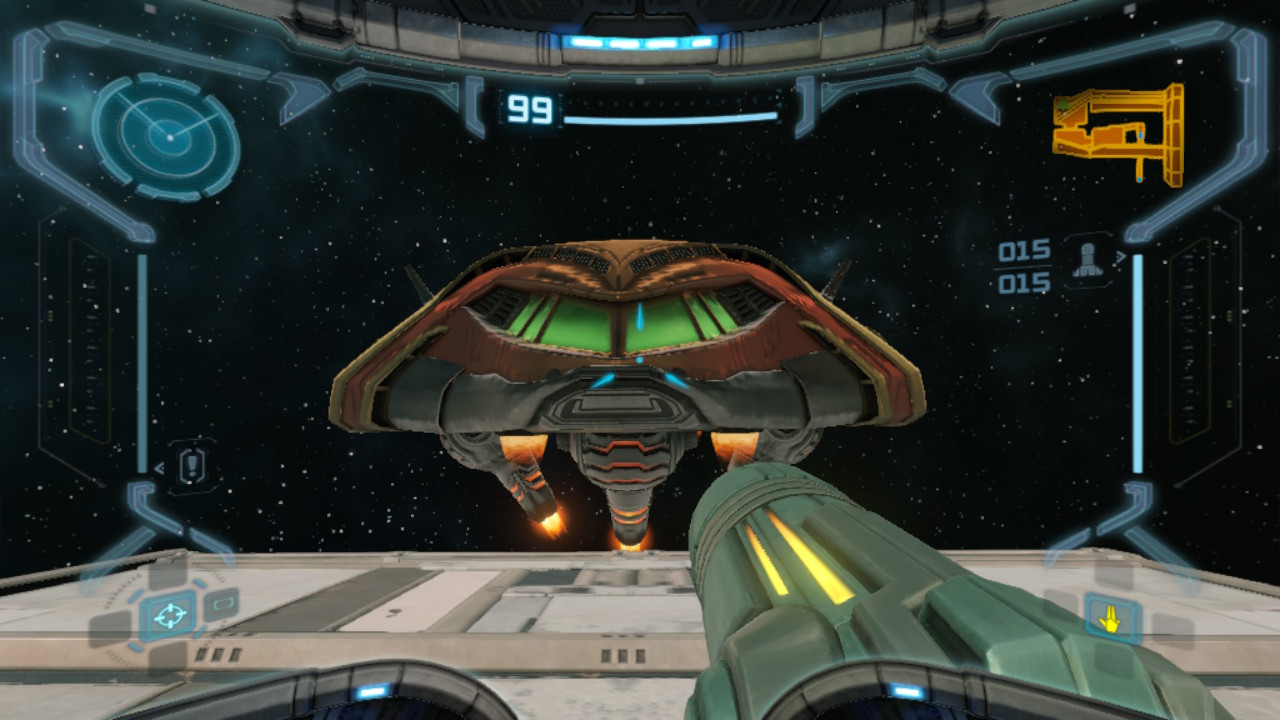 Sie geht zwar als Siegerin aus dem Kampf, doch das Schiff leitet zeitgleich die Selbstzerstörung ein und Samus flieht. Unglücklicherweise verliert ihr Anzug auf der Flucht fast alle Fähigkeiten. Samus rettet sich zwar auf ihr Raumschiff, sieht jedoch, wie die Wiederbelebung Ridleys auf den Planeten Tallon IV flüchtet und nimmt die Verfolgung auf.