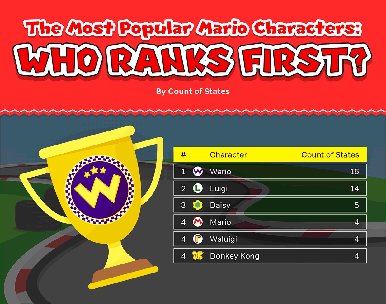 Um den beliebtesten Charakter zu bestimmen, hat Chicco die Daten der letzten fünf Jahre von Google Trends genutzt. Auf der Karte sind besonders viele grüne Ls zu sehen, weshalb deutlich wird, dass Luigi ein äußerst beliebter Charakter ist und seinen Bruder Mario tatsächlich auch schlägt.