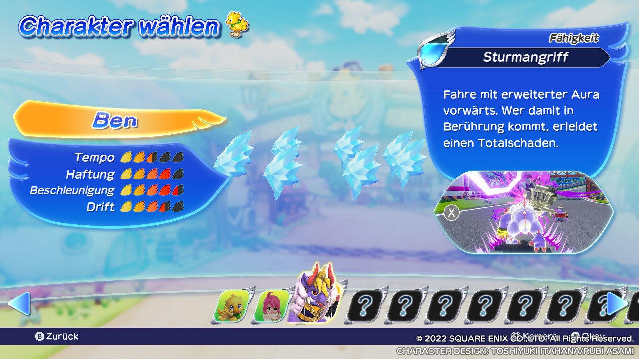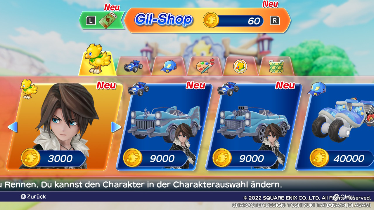 In der Charakter-Auswahl gibt es zudem unzählige Fragezeichen für noch nicht freigeschaltete Charaktere. Wie lange es dauert, die 3.000 Gil für Squall zu sammeln und unter welchen Voraussetzungen weitere Charaktere freigeschaltet werden, können uns Chocobo-GP-erfahrene NutzerInnen gern im Kommentarthread mitteilen! Und so vielleicht anderen Fans helfen.