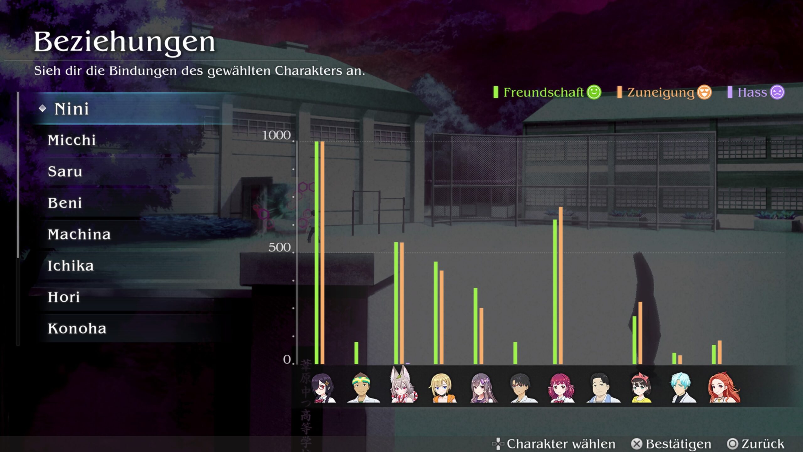 Dabei spielt das Beziehungssystem eigentlich so einen integralen Bestandteil im Spiel. Jede Figur verfügt über drei Leisten: Freundschaft, Zuneigung und Hass. Diese beeinflussen die Beziehung zum Protagonisten, der Figuren untereinander, aber auch letztlich zu euren Gegnern. Eine wirklich gute Idee, die viel Potenzial bietet.