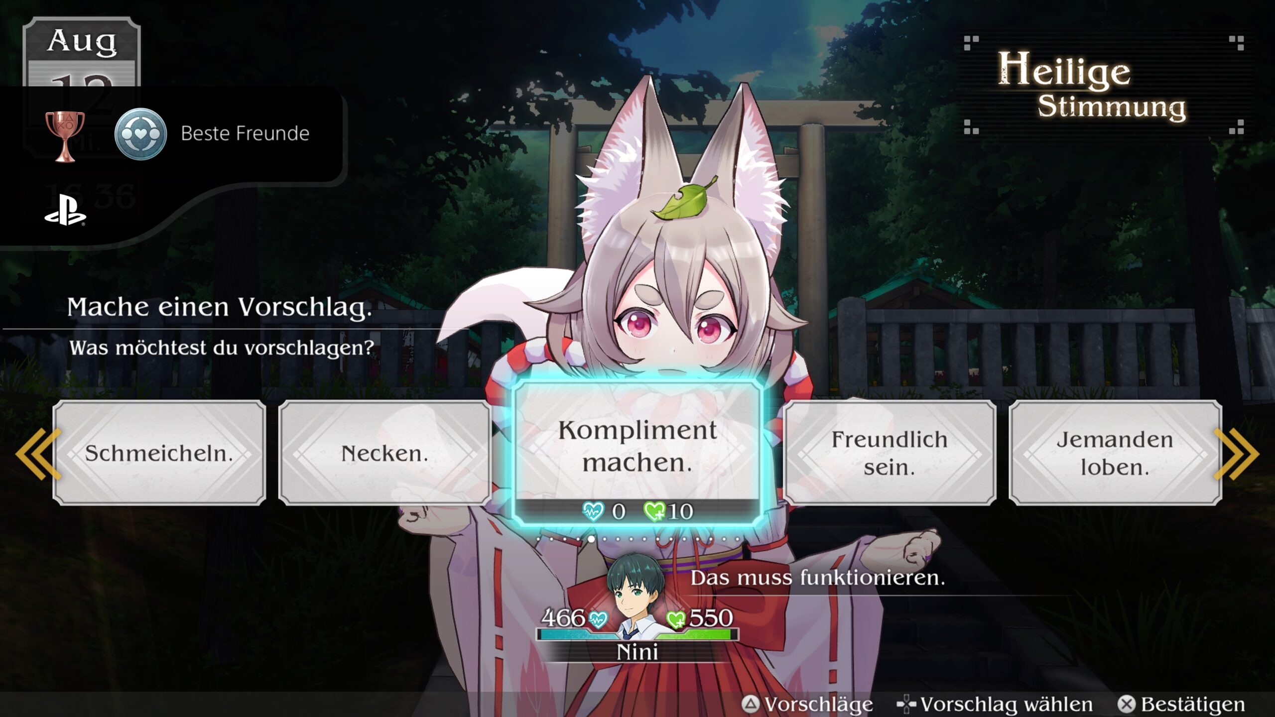 Die zuvor angesprochenen Emotionsleisten können mit unterschiedlichen Dialogoptionen beeinflusst werden. Neckt ihr einen Charakter, ist dieser eher dazu geneigt euch mit der Zeit zu hassen. Macht ihr ihnen Komplimente oder lobt ihr andere Charaktere, erhöhen sich hingegen die Werte für Freundschaft und/oder Zuneigung.
