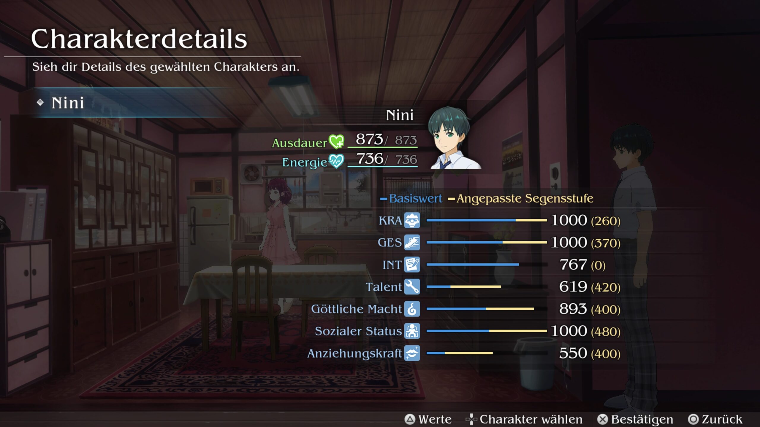 Verbessert ihr eure Werte und Beziehungen zu den Charakteren, werden euch auch neue Angriffs- und Unterstützungsfähigkeiten zur Verfügung gestellt. Allerdings hält sich das in Grenzen und selbst ausgebaute Charaktere verfügen nur über eine Handvoll an aktiven und unterstützenden Fähigkeiten. Daneben könnt ihr für das Verbessern eurer Beziehungen sogenannte Segen erhalten.