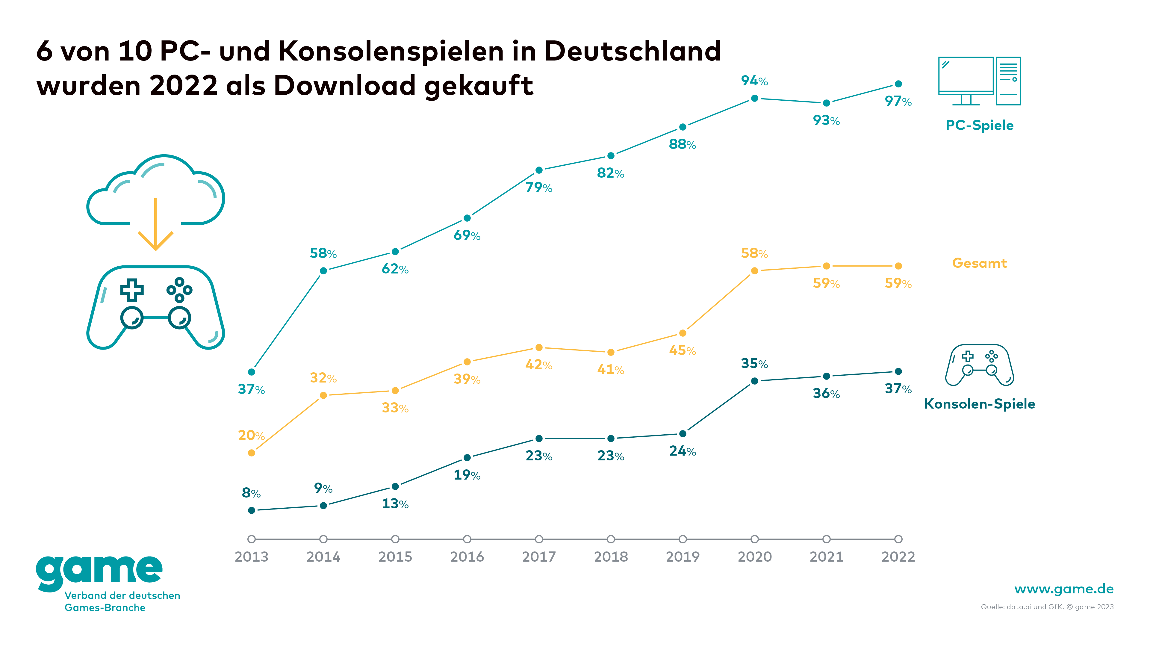 2022 kauften 59 Prozent der Gaming-Fans ihre Spiele digital, in den Jahren zuvor waren es ebenfalls 59 respektive 58 Prozent. Doch diese Zahl ist verwaschen vom PC-Markt, auf dem schon seit Jahren 9 von 10 Spielen digital gekauft werden. Betrachtet man nur den nicht unerheblichen Konsolen-Markt, so ist das Gegenteil der Fall. 63 Prozent der Spiele-Verkäufe waren 2022 physischer Natur, in den Jahren zuvor 64 respektive 65 Prozent. Der rasante Anstieg der Vorjahre verpuffte