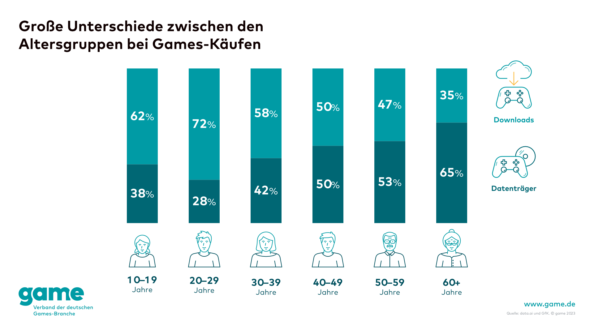 Für einen großen Sprung hatte das erste Corona-Jahr 2020 gesorgt, auch auf dem Konsolen-Markt. Wer hier auf digital umstieg, blieb offensichtlich dabei. Auch das Alter spielt eine große Rolle: Je älter die NutzerInnen, desto weniger digital kaufen sie. Gut möglich also, dass der physische Absatz letztlich über die Generationen ausstirbt.