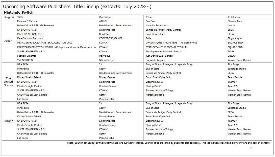 Darüber hinaus listet Nintendo Luigi’s Mansion: Dark Moon und das Spiel mit Prinzessin Peach für 2024. Weiterhin „to be announced“, na klar: Metroid Prime 4. Auch mit einigen Third-Party-Spielen schmückt Nintendo den Geschäftsbericht. Allen voran sind da Persona 5 Tactica oder auch Star Ocean: The Second Story R. Die wenigsten davon erscheinen allerdings zumindest Konsolen-exklusiv für Nintendo Switch, dazu zählt demnächst beispielsweise Fae Farm.
