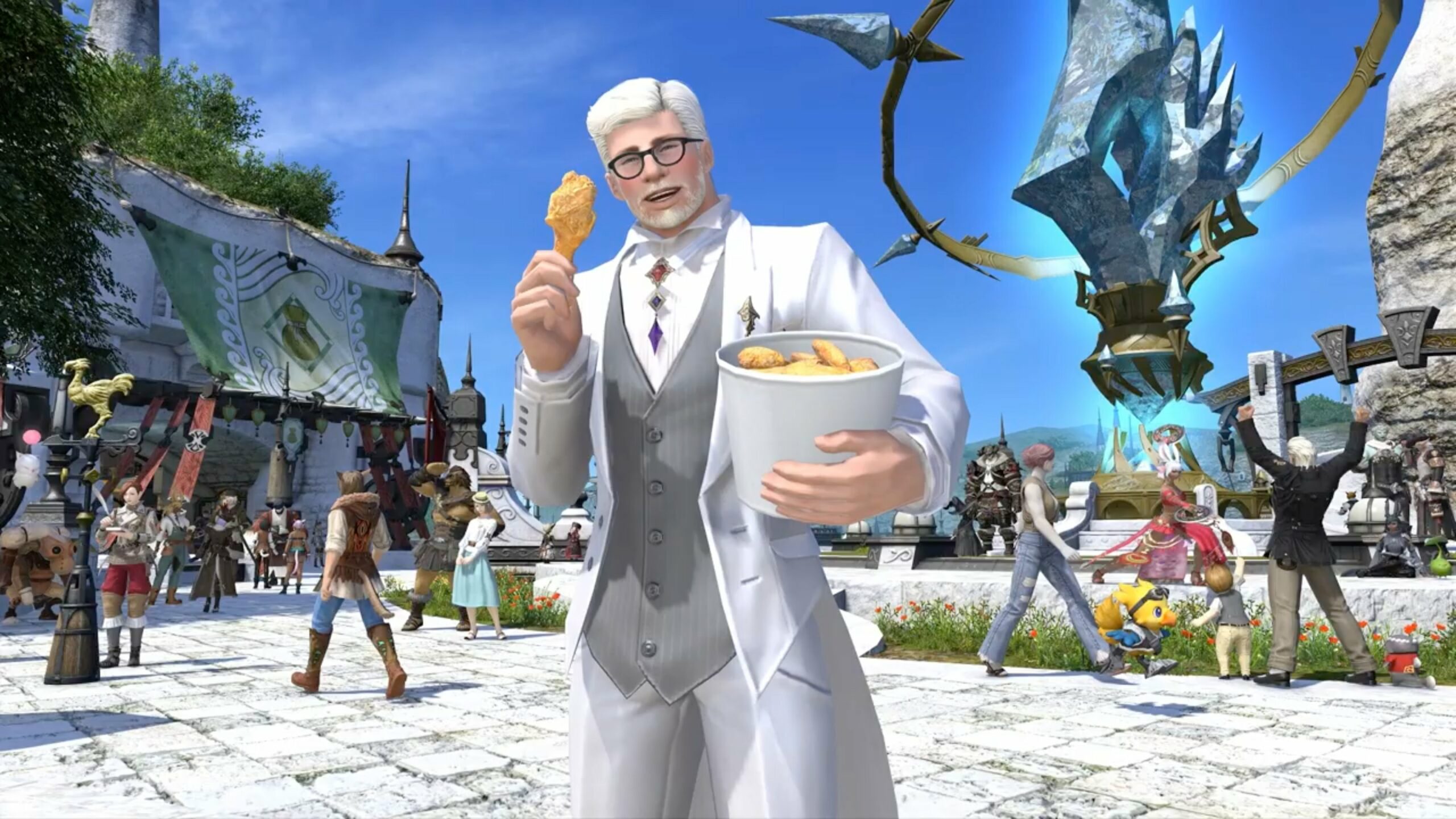 Square Enix Senior Manager David Lee hat auf Twitter geteilt, wie die Kollaboration auf der Videospielmesse beworben wurde: Am Stand des Online-MMORPGs war eine lebensgroße Figur von Colonel Sanders zu sehen, der Werbefigur von KFC.