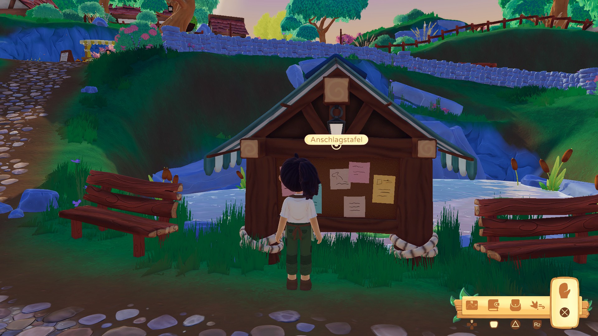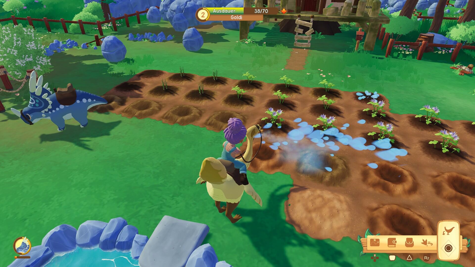 In nur wenigen Minuten lernen wir alles, was wir für ein Farmleben mit Dinos brauchen. Ruckzuck können wir Dinos reiten und ihre Fähigkeiten nutzen, um Geröll, Steine und andere Hindernisse aus dem Weg zu räumen. Die Anwohner nehmen uns alle herzlich in ihrer Mitte auf und decken uns mit den wichtigsten Werkzeugen ein. Mit Hacke und Schaufel kümmern wir uns um die Felder und die Hinterlassenschaften unserer Mitbewohner. Mit der Kanne gießen wir die Pflanzen. Der hiesige Handwerker Marlo zeigt uns dann noch, wie wir eine Koppel bauen und Objekte bewegen können.