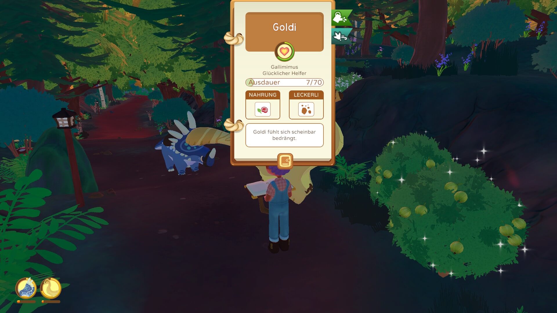 Ein Gallimimus mag beispielsweise keine Frühlingszwiebeln, dadurch sinkt sein Interesse stark. Geben wir ihm aber eine Karotte, ist uns seine Zuneigung sicher. Erreicht der Zeiger den grünen Bereich, können wir dem Dino einen Poppin geben, um die Freundschaft zu besiegeln.