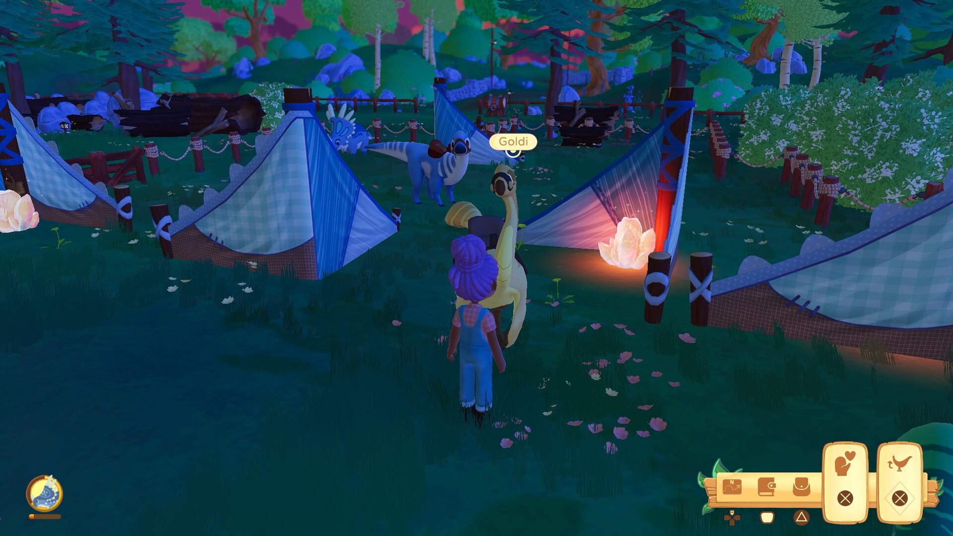 Und schon haben wir einen neuen Freund gewonnen! Damit dieser uns aber bei der Arbeit hilft, müssen wir uns auch ordentlich um ihn kümmern. Die Größe der Koppel muss stimmen, er braucht jeden Tag Futter und natürlich einen Schlafplatz. Dafür müssen wir Traumsteine finden, die überall in Paleo Pines verstreut sind.