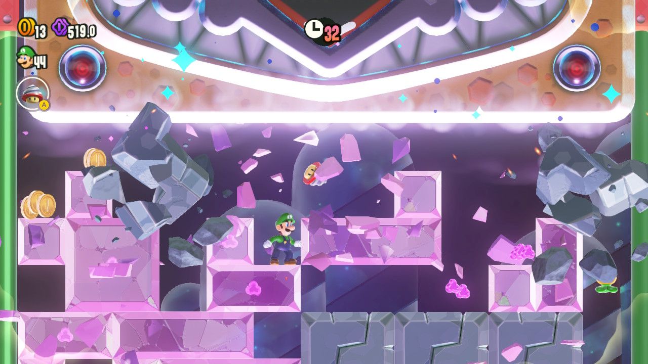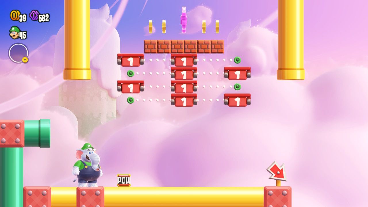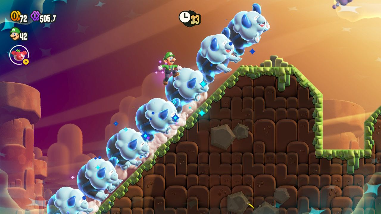 In jedem Level versteckt sich darüber hinaus eine Wunderblume. Berührt sie und macht euch bereit für richtig abgedrehtes Level-Design. Röhren verselbstständigen sich, Gallopteros-Horden bahnen sich den Weg durch das Level und ihr reitet auf ihnen durch selbiges, der Boden bewegt sich oder die Perspektive wechselt in „Top-Down“.