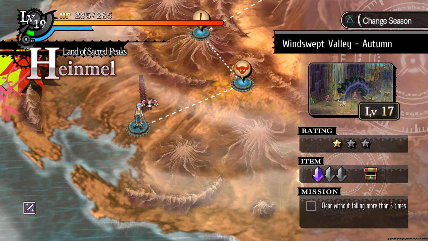 Ihr bewegt euch also – anders als in Ys und Trails – nicht frei durch die Welt. Stattdessen weist das Spiel eine levelartige Struktur auf. Die einzelnen Dungeons bieten dabei überschaubare Einheiten und sind selten länger als fünf bis zehn Minuten. Dafür gibt es aber umso mehr von ihnen: Über 20 davon warten in jeweils mehreren Jahreszeiten auf. Zu Beginn steht jeweils nur eine Jahreszeit zur Verfügung, doch im Spielverlauf schaltet man weitere frei.