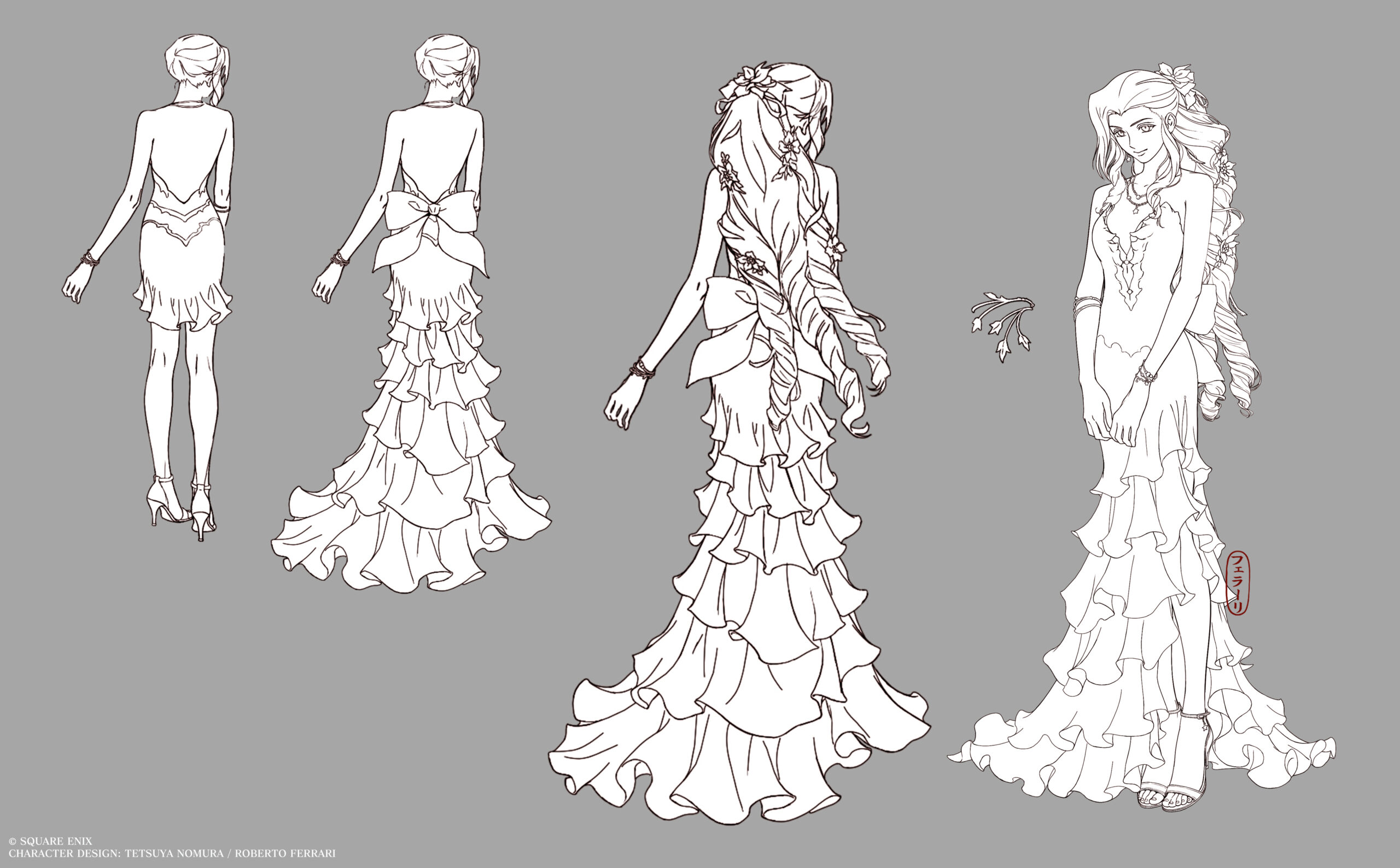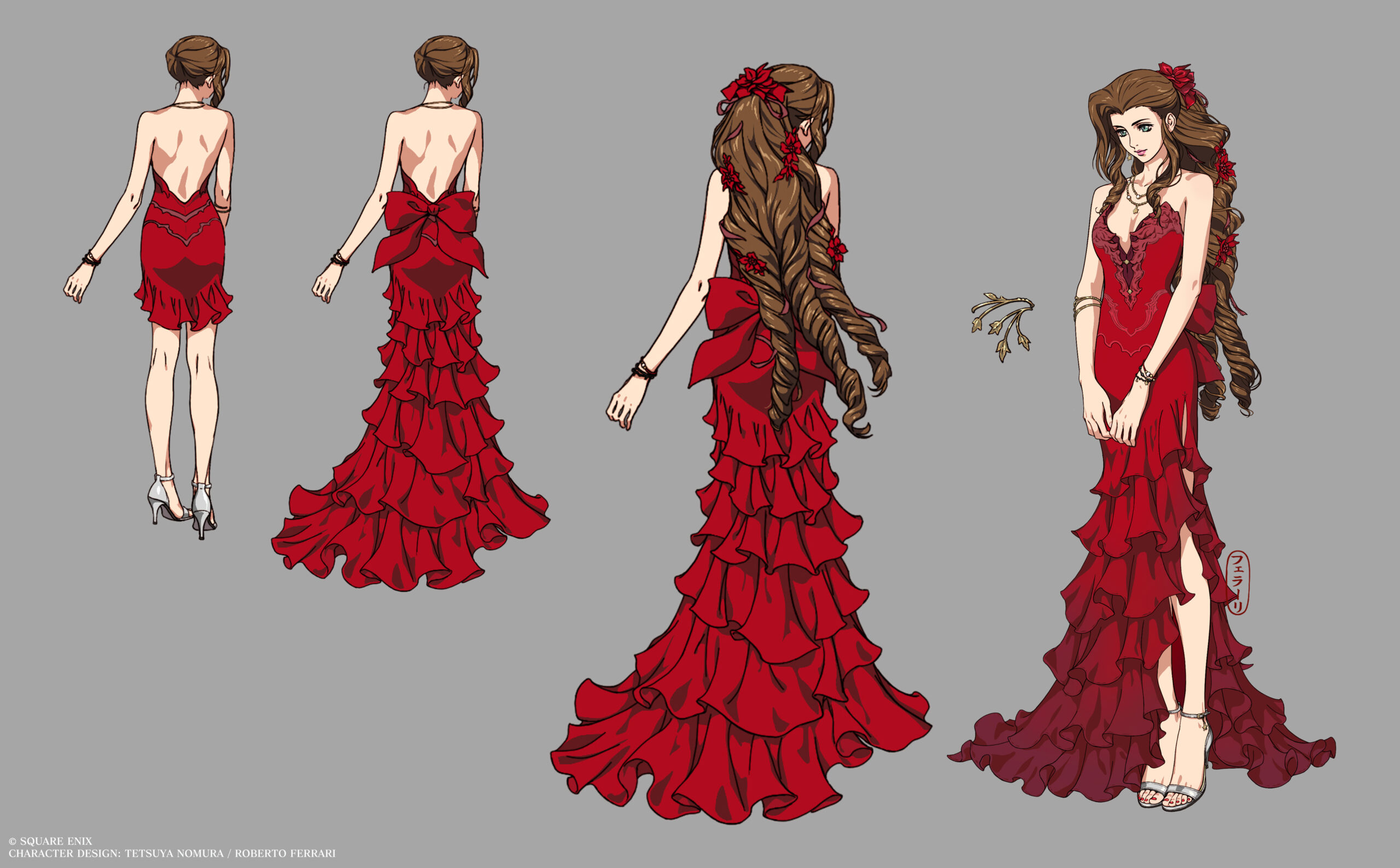 So weist man auf Aeriths lange Haare hin – sie trägt hier Extensions. „In diesem Outfit sieht Aerith aus, als könnte sie eine Flamenco- oder Tangotänzerin sein. Es macht Spaß, sie in einem kühnen, feurig-roten Kleid wie diesem zu sehen, da es eine solche Abweichung von ihrem üblichen Stil ist. Übrigens, falls du dich fragst, warum ihre Haare plötzlich so viel länger aussehen, das liegt daran, dass sie Extensions benutzt hat“, kommentiert Character-Designer Roberto Ferrari.