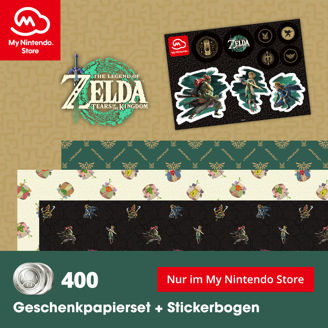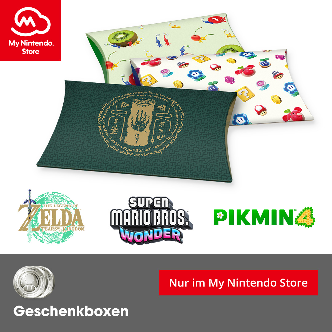 Für 400 Platin-Punkte erhaltet ihr ein Geschenkpapier-Set zu Zelda: Tears of the Kingdom und als Bonus einen Stickerbogen. Für jeweils 150 Platin-Punkte winken Geschenkboxen im Design von Pikmin 4, Zelda: Tears of the Kingdom oder Super Mario Bros. Wonder. Die Geschenkboxen könnt ihr bis zu viermal pro Account bestellen.