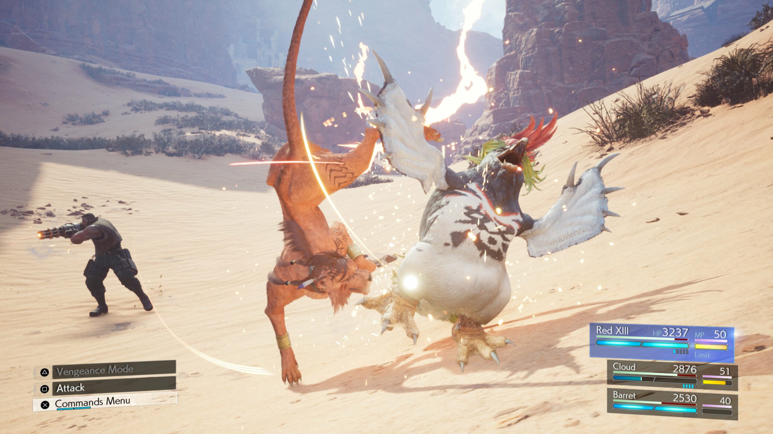 Mit weiteren Bildern stellt den Kampfstil von Red XIII vor. Mit seinen scharfen Klauen schlägt er die Gegner. Er kann auf ein breites Arsenal an Fähigkeiten zurückgreifen, von physischen Schlägen bis zu magischen Fernangriffen. „Stardust Ray“ wirkt eine explodierende Lichtkugel, die alle Feinde versengt. Blockt ihr mit Red XIII Angriffe, klettert die Vengeance-Anzeige und ihr könnt in den Vengeance-Modus wechseln, der physische Angriffe stärkt und Ausweichfähigkeiten verbessert. „Siphon Fang“ ist ein kräftiger Schlag, der einen Teil der HP des Gegners absorbiert, ohne ATB zu verbrauchen.