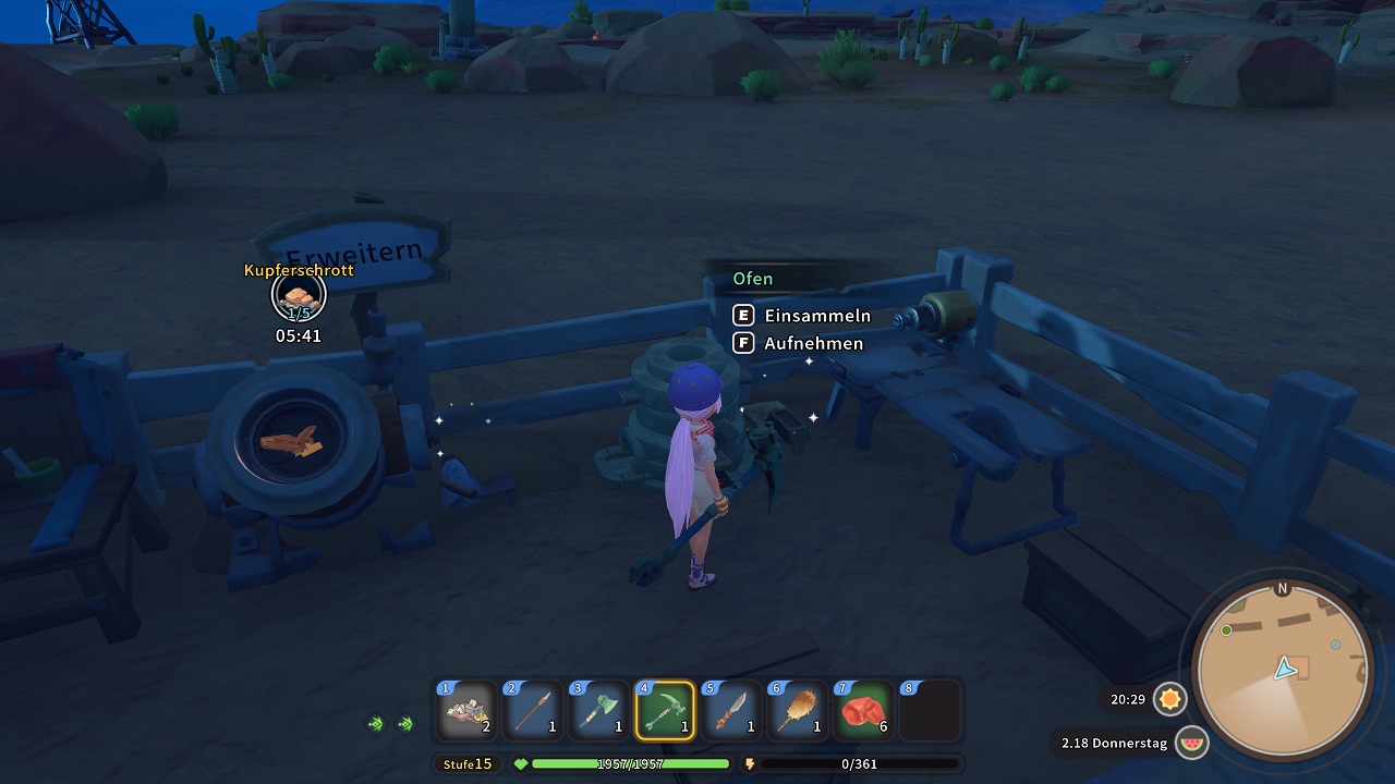 Der Einstieg ins Spiel geht für KennerInnen von My Time at Portia leicht von der Hand. Wir wachen in unserem Haus auf und machen uns morgens daran, Ressourcen einzusammeln und daraus verschiedene Bauteile zu erschaffen.