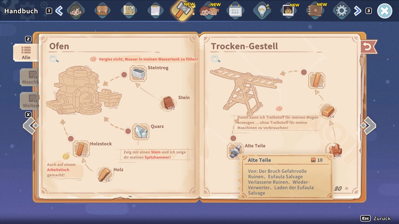 Es gibt eine Plattform, an der wir aus einem wirklich detaillierten Handbuch auswählen können, welches Bauwerk wir als Nächstes erschaffen. Dieses Buch ist wirklich liebevoll gestaltet, enthält Tipps & Notizen und stellt bildlich schön dar, wie die Craftingkette für das Bauwerk aussieht.