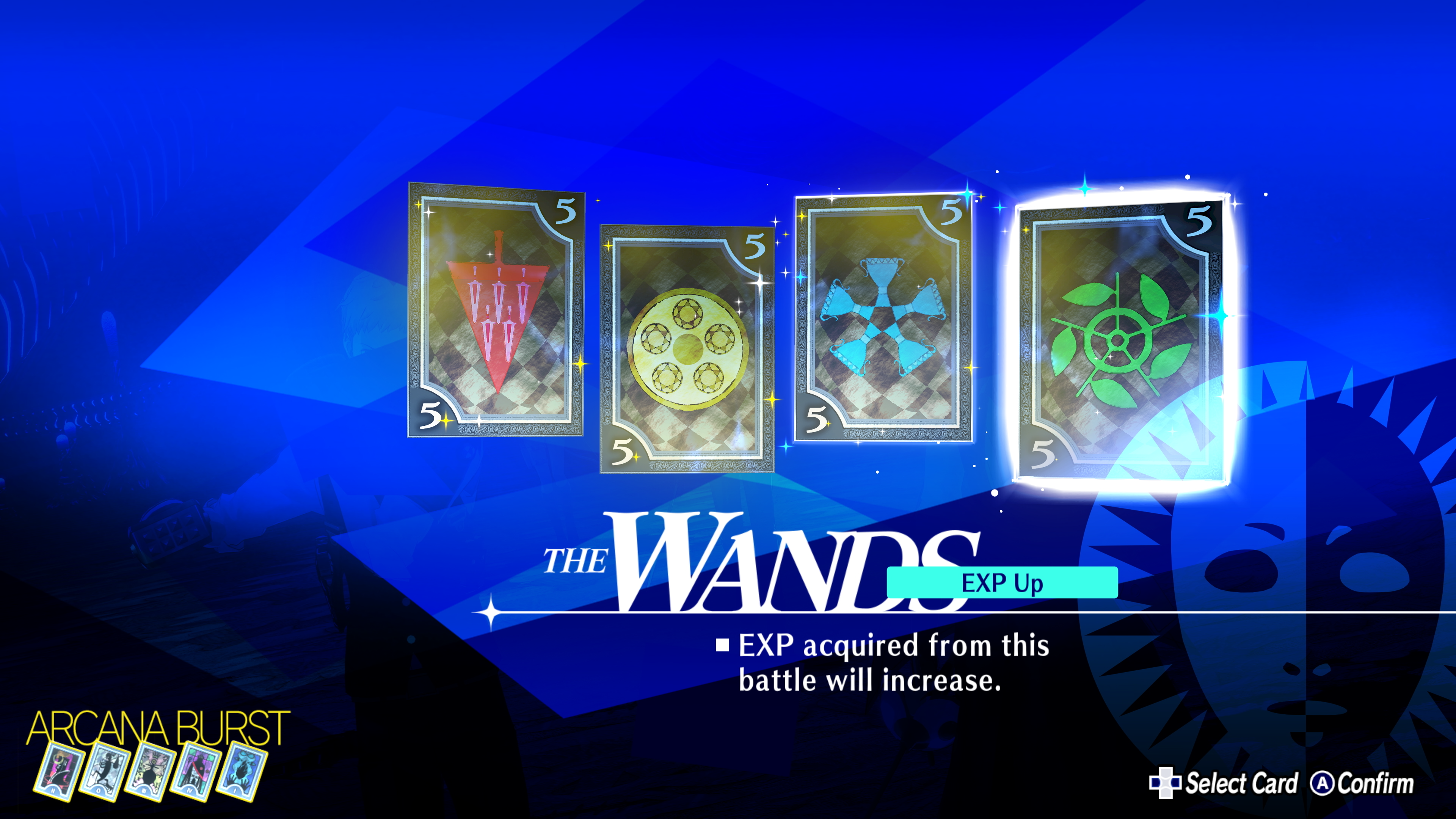 Nicht zuletzt warten natürlich auch viele Kämpfe im Tartarus. Nach einem siegreichen Kampf geht es in die Bonusrunde namens Shuffle Time. Karten, die ihr hier auswählt, verleihen besondere Effekte und Personas. Manchmal findet ihr auch „Große Arkana“-Karten mit Spezialeffekten. Sammelt alle dieser Karten für einen Arkana-Schub, der „Kleines Arkana“-Karten für den Rest des Tages hochstuft.