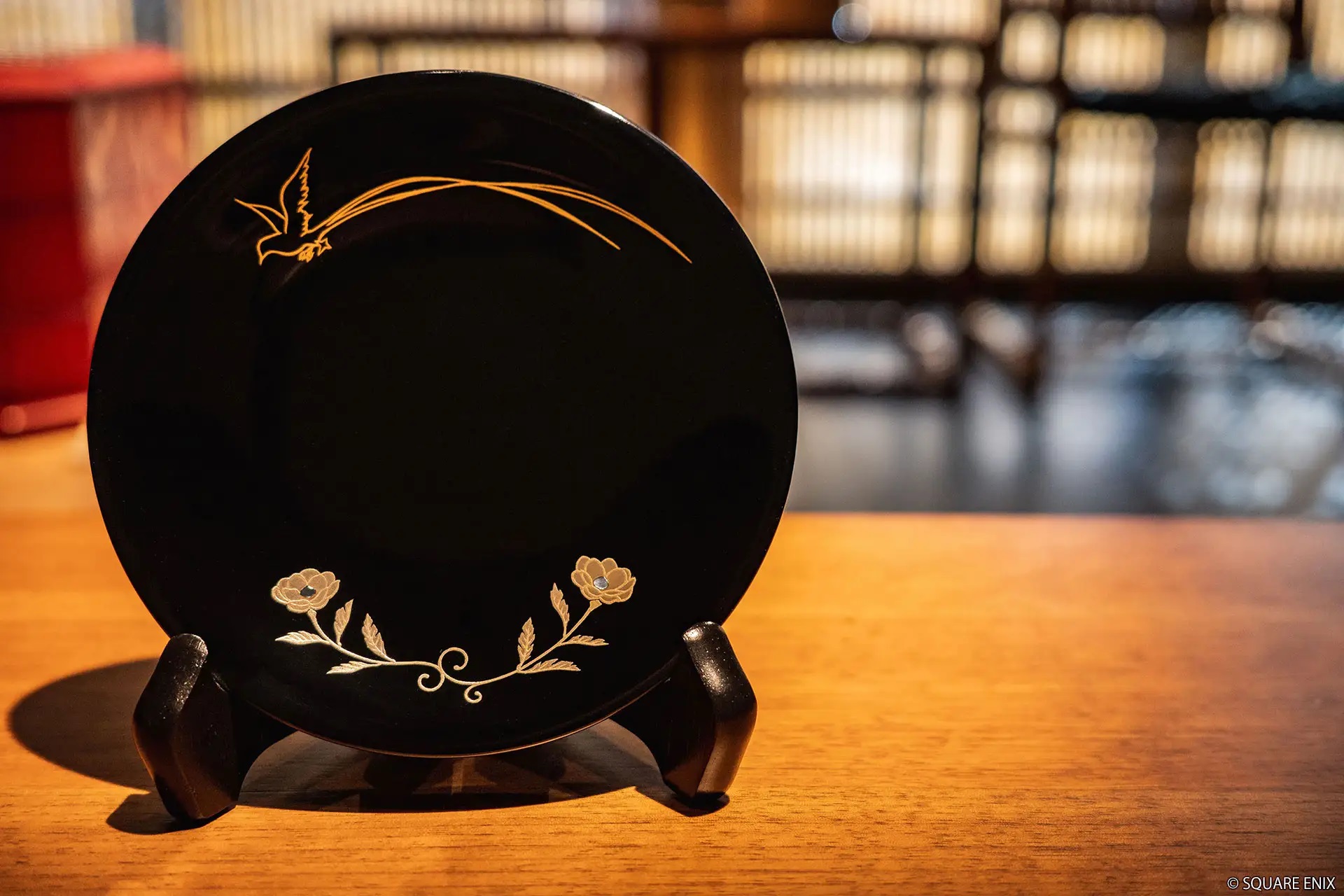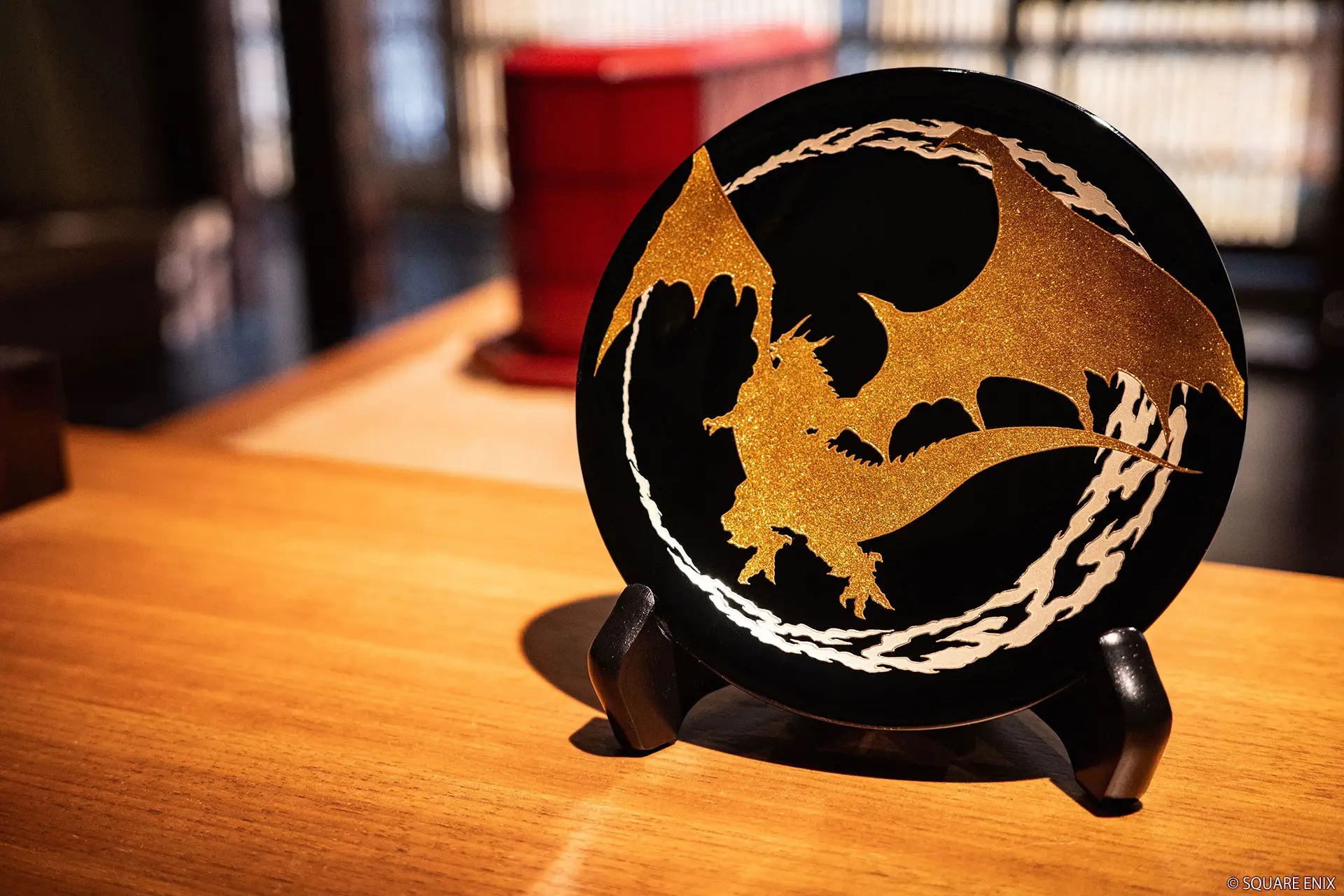 Zudem wird es mit dem Maki-e Decorative Plate FINAL FANTASY einen ganz besonderen Teller geben. Hier ist wieder ein goldener Bahamuth in der Mitte zu sehen, allerdings dieses Mal mit einem leuchtenden Himmelskörper über sich. Er soll während des Fan-Festivals von Final Fantasy XIV in Tokyo ausgestellt werden.