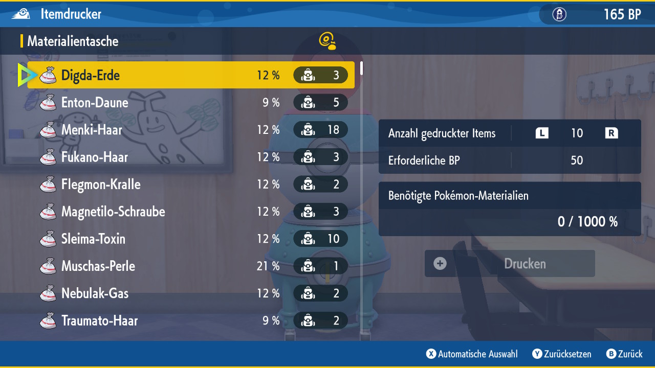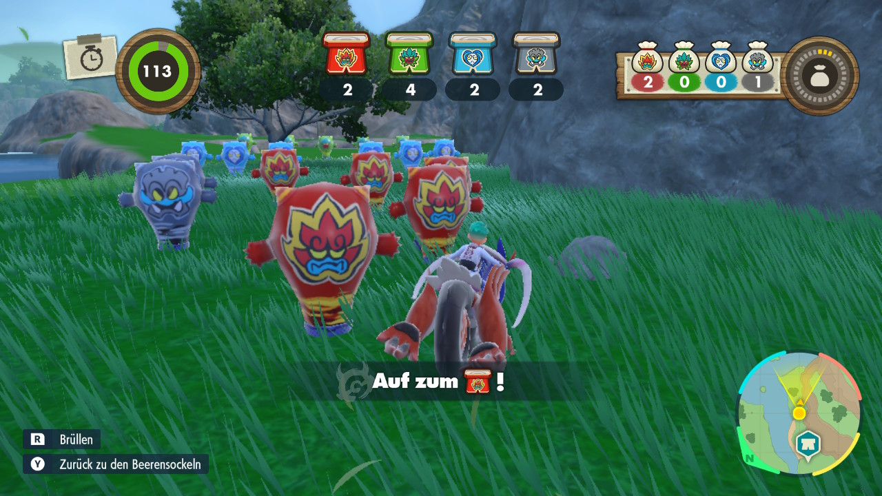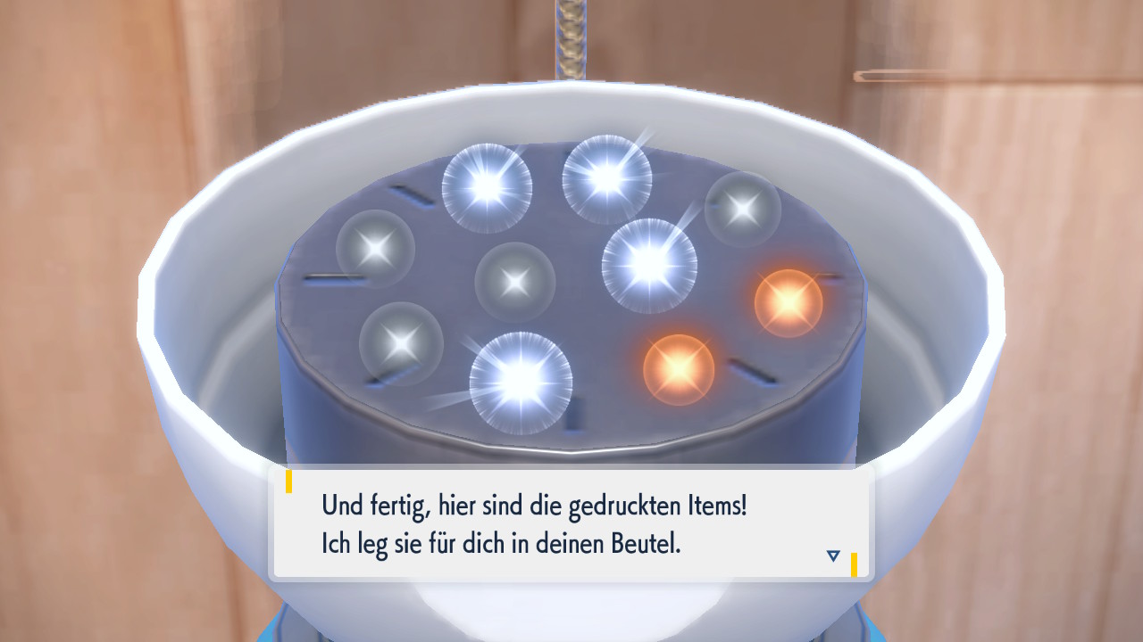 Um uns das Leben leichter zu machen, können wir beim Erkunden kleine Missionen abschließen, für die wir Blaubeer-Punkte, kurz BP, erhalten. Diese können wir wiederum gegen Items und zusätzliche Funktionen aller Art eintauschen. Beispielsweise erhalten wir für das Fotografieren bestimmter Pokémon oder durch das Sammeln von zehn Gegenständen auf dem Boden Punkte, mit denen wir die Item-Maschine freischalten können. Diese wandelt Pokémon-Materialien in zufällige Items um, ähnlich wie die TM-Maschine. Von Belebern über Kampfitems und Entwicklungssteine bis hin zu Tera-Stücken ist hier alles dabei. Und umso mehr wir die Maschine benutzen, umso weiter können wir sie aufrüsten.