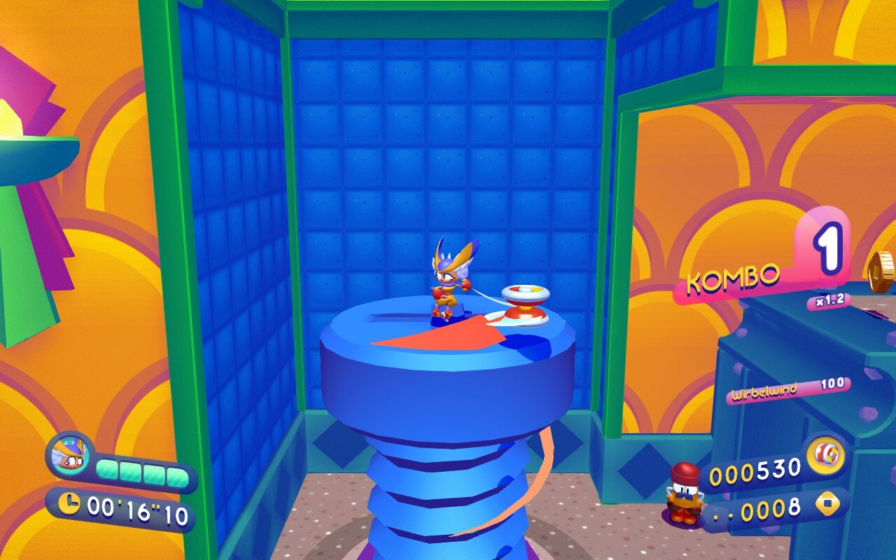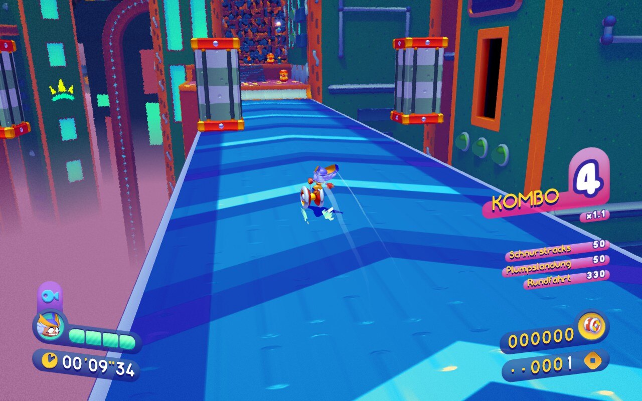 Alles in allem motivieren sowohl die Münzen als auch die Nebenaufgaben dazu, nicht nur schnell, schnell durch die Level zu rennen. Dennoch fühlte ich mich durch die Art, wie sich Penny steuern ließ, eher dazu motiviert auf Geschwindigkeit anstatt Gemütlichkeit zu setzen. Zuerst wollte ich deswegen das Spiel mit einem gewissen blauen Igel vergleichen, doch auch von Sonic unterscheidet sich Penny im Spielgefühl. Ihre Bewegungen sind von einem Momentum erfüllt, das euch im Idealfall mit einem wunderbaren Gefühl zurücklässt, wenn ihr mit eurem Yo-Yo durch die Level schwingt. Bei mir war leider öfters das Gegenteil der Fall, weil ich gegen eine Wand gefahren oder geschwungen bin, was den Fluss durchaus störte. Penny fühlt sich weniger glatt an als ein Mario, dessen Steuerung natürlich und super angenehm ist, und lernt auch nicht ständig neue Fähigkeiten wie ein Banjo, was ein Gefühl von Fortschritt liefern würde.