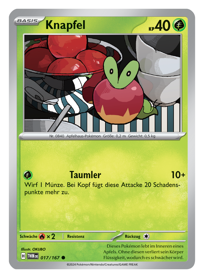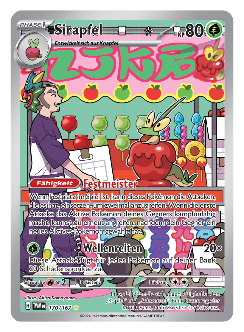 Vor einigen Tagen stellten wir euch die Entwicklungsreihe von Panflam inklusive einer Illustration-Rare-Karte von Panferno vor. Heute geht es mit Knapfel und seiner Entwicklung Sirapfel weiter. Sirapfel ist, wie ihr seht, ebenfalls eine Illustration-Rare-Karte!